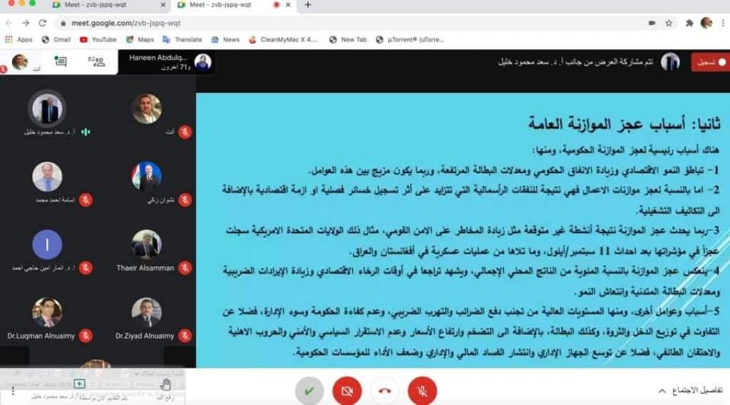 Our college, through electronic platforms, and in cooperation with the Center for Regional Studies and the College of Administration and Economics / University of Mosul, held an electronic scientific symposium on Sunday, corresponding to 10/1/2021, entitled (Financing the financial deficit in the Iraq 2021 budget: an economic _ legal vision)