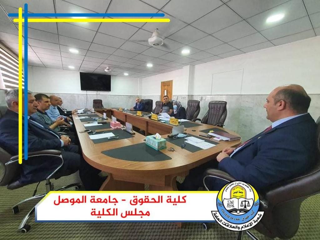 Assistant Professor Dr. Wissam Neamat Ibrahim Al-Saadi, Dean of the College of Law at the University of Mosul, chaired on Sunday, August 15, 2021, the nineteenth session of the meeting of the College Council, in the presence of all its members, in which the directions of the meeting of the University Council in its twentieth session held on August 9, 2021 regarding the conduct of the final exams for students of preliminary study and exams were transferred. The end of the second course for postgraduate students for the current academic year 2021/2020, especially with regard to the directives of the crisis cell related to the Corona pandemic, the need to adhere to preventive measures and the importance of taking the vaccine in the concerned health centers. For students of science studies