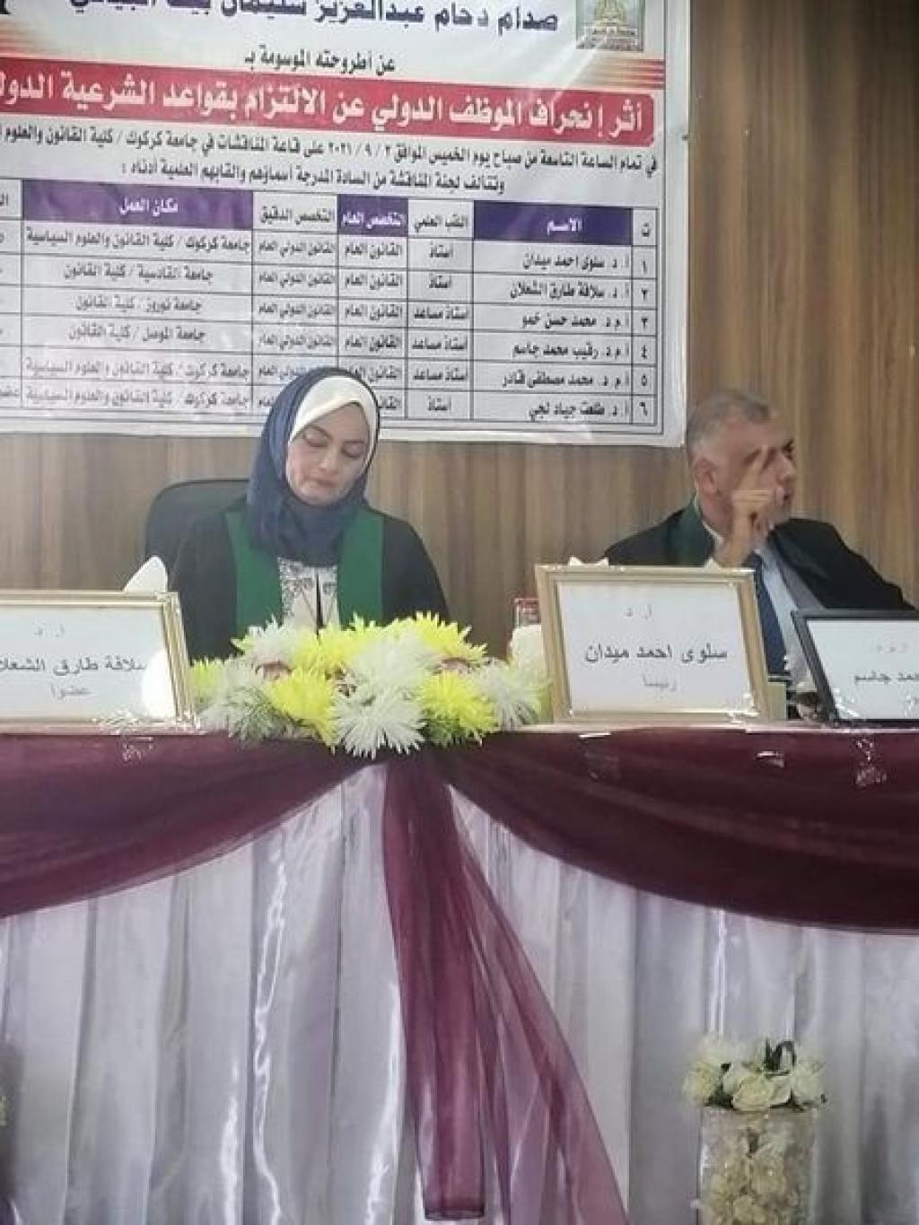 On Thursday, September 2, 2021, Assistant Professor Dr. Raqib Muhammad Jassim, one of the teachers of the Human Rights Law Branch, participated in the discussion of the doctoral student Saddam Daham Al-Bayati / College of Law and Political Science / University of Kirkuk about his thesis tagged following the deviation of the international employee from adhering to the rules of legitimacy. The committee accepted the student’s thesis and he was awarded a doctorate in public international law, and this participation reflects the scientific sobriety and the prestigious academic position enjoyed by the professors and teachers of our dear college and our prestigious university
