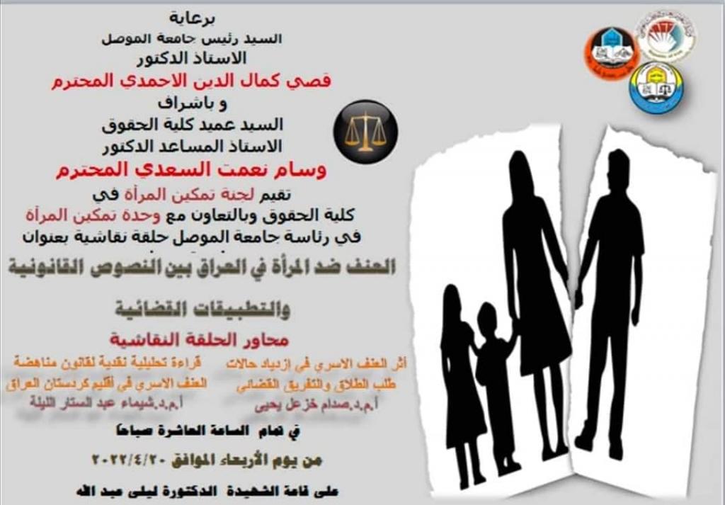 Under the patronage of Prof. Dr. Qusay Kamal Al-Din Al-Ahmadi, President of Mosul University and under the supervision of Assistant Professor Dr. Wissam Nemat Ibrahim Al-Saadi, Dean of the Faculty of Law at the University of Mosul, and in the presence of the members of the Faculty Council, the Women Empowerment Committee was established in our faculty in cooperation with the Women Empowerment Unit at the Presidency of the University of Mosul on Wednesday, April 20, 2022 The discussion panel tagged (violence against women in Iraq between legal texts and judicial applications), where the episode was based on two axesThe first axis: the impact of domestic violence on the increase in cases of divorce requests and judicial separation, during which Dr. Saddam Khazal Yahya presented a research paper in which he explained what is meant by domestic violence and the extent to which it can be considered a reason for judicial separation in addition to an official statistic of divorce and judicial separation for the year 2022The second axis: a critical analytical reading of the law against domestic violence in the Kurdistan region of Iraq, in which Dr. Shaima Abdul-Sattar Jabr presented a research paper in which she addressed the legal rules established in light of many international and national legislation, including the Universal Declaration of Human Rights and the International Covenant on Civil and Political Rights to confront a crime Domestic violenceIn Iraq, the rules of the Personal Status Law and the rules of the Penal Code deal with the phenomenon of domestic violence. It is noted that the legislator in the Kurdistan region of Iraq tried to develop an integrated legal organization to confront the phenomenon of domestic violence in accordance with Law No. 8 of 2011. It is worth mentioning that the workshop aims to shed light on the The phenomenon of domestic violence as a phenomenon that is witnessing an increasing spread and its direct effects on the family and society and its stability. The episode came out with many recommendations that were submitted to the relevant authorities, and this workshop comes within the series of scientific, cultural and student activities of our college during the current academic year 2021-2022
