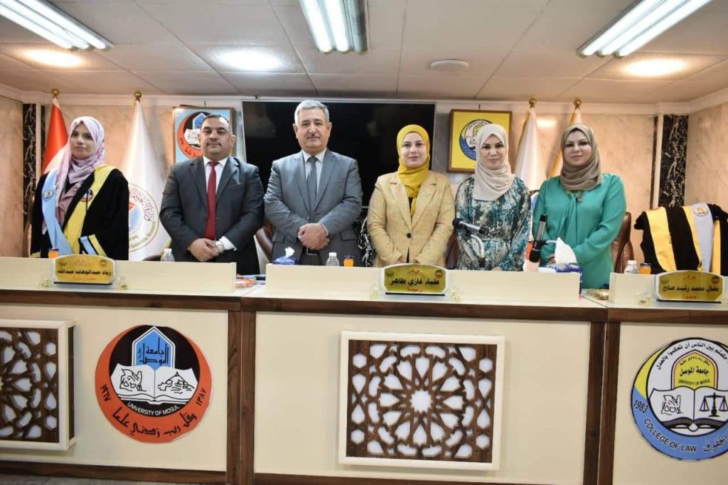 On Sunday, July 17, 2022, the Human Rights Law Branch at the College of Law at the University of Mosul discussed a higher diploma research on the impact of the state of emergency on the implementation of human rights conventions. Part of it was attended by Assistant Professor Dr. Wissam Nemat Ibrahim Al-Saadi, Dean of the College and a number of members of the College Council and its teachers.