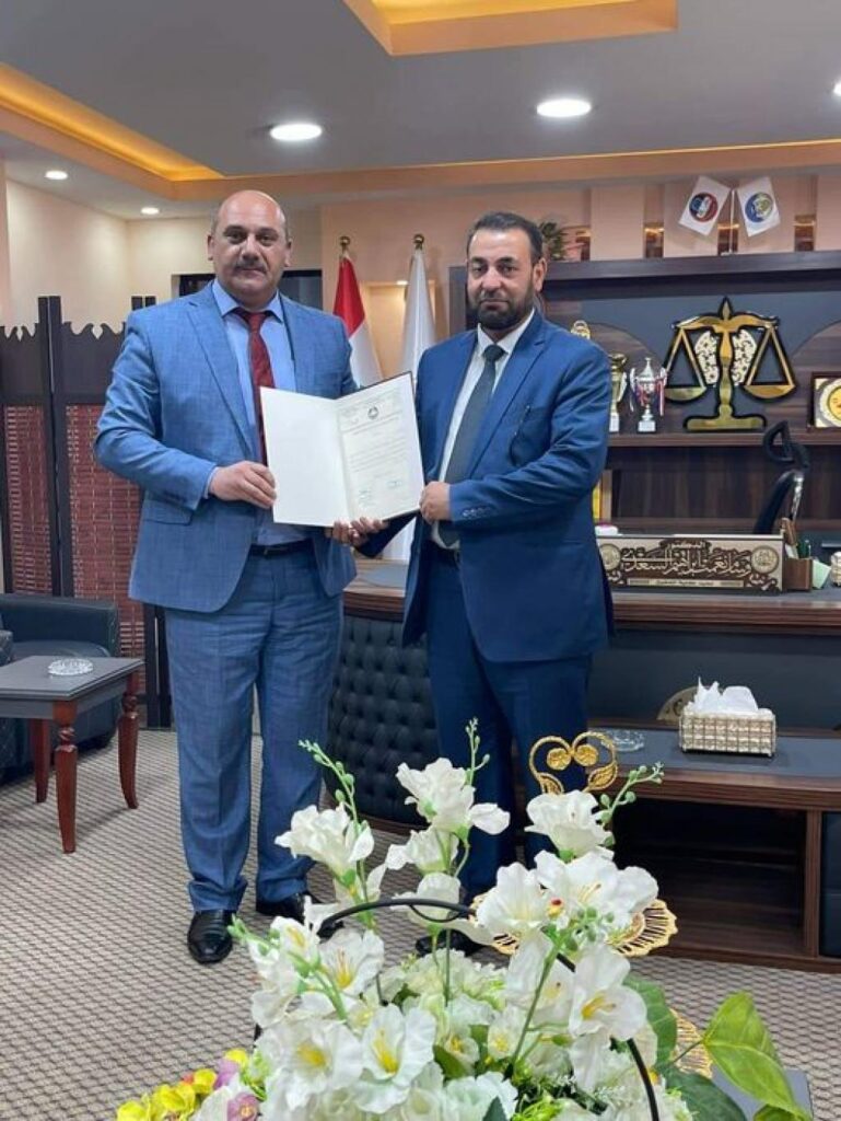 Due to the distinguished efforts made by Dr. Sajer Nasser Hamad/Faculty of Law, Tikrit University in supporting the scientific, cultural and student activities in our college, in addition to bearing the hardships of travel and his participation in the discussion of a doctoral student in the private law branch, Najwa Muhammad Salem, he was honored with a certificate of appreciation by the Assistant Professor Dr. Wissam Neamat Ibrahim Al-Saadi, Dean of the College, and in turn, congratulates the Dean of the College, the members of the College Council, its scientific and administrative staff, and its students, Dr.