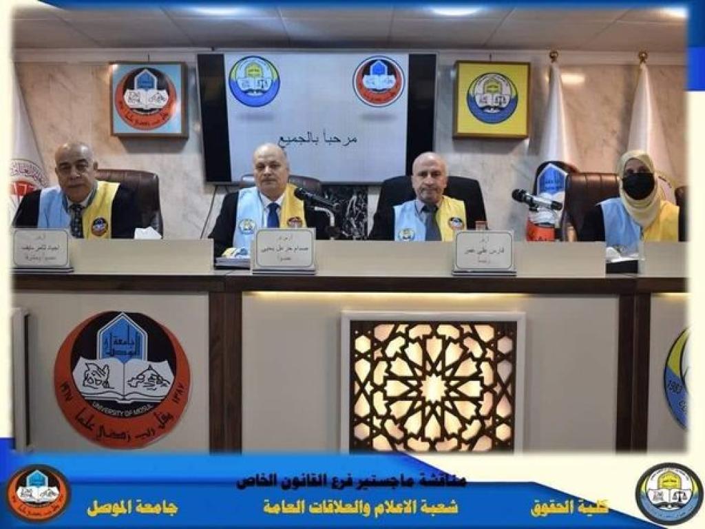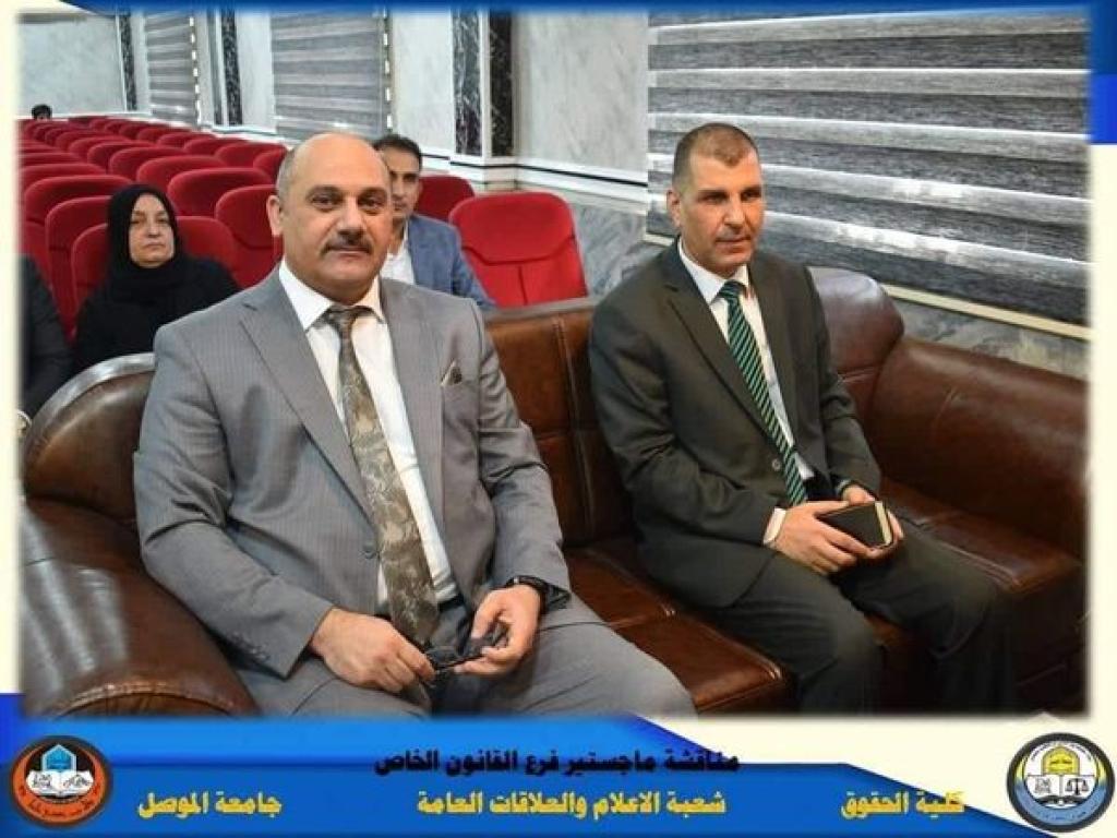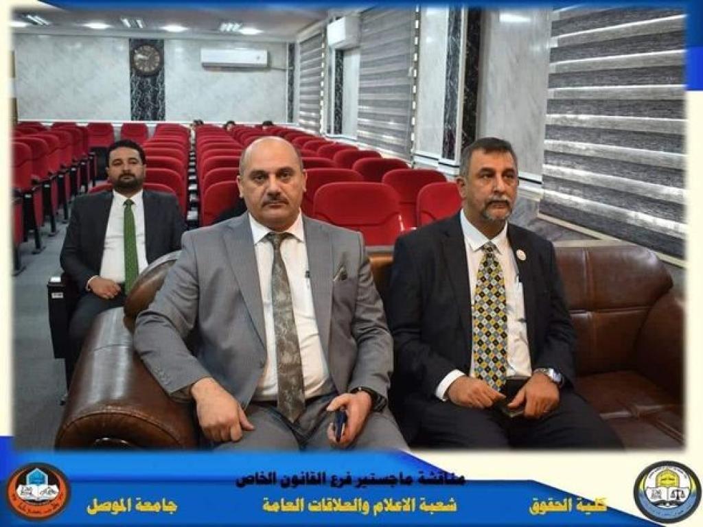 On Sunday, October 23, 2022, the Private Law Branch of the College of Law at the University of Mosul discussed a master’s thesis on procedural fraud in civil advocacy/a comparative study, part of which was attended by Assistant Professor Dr.