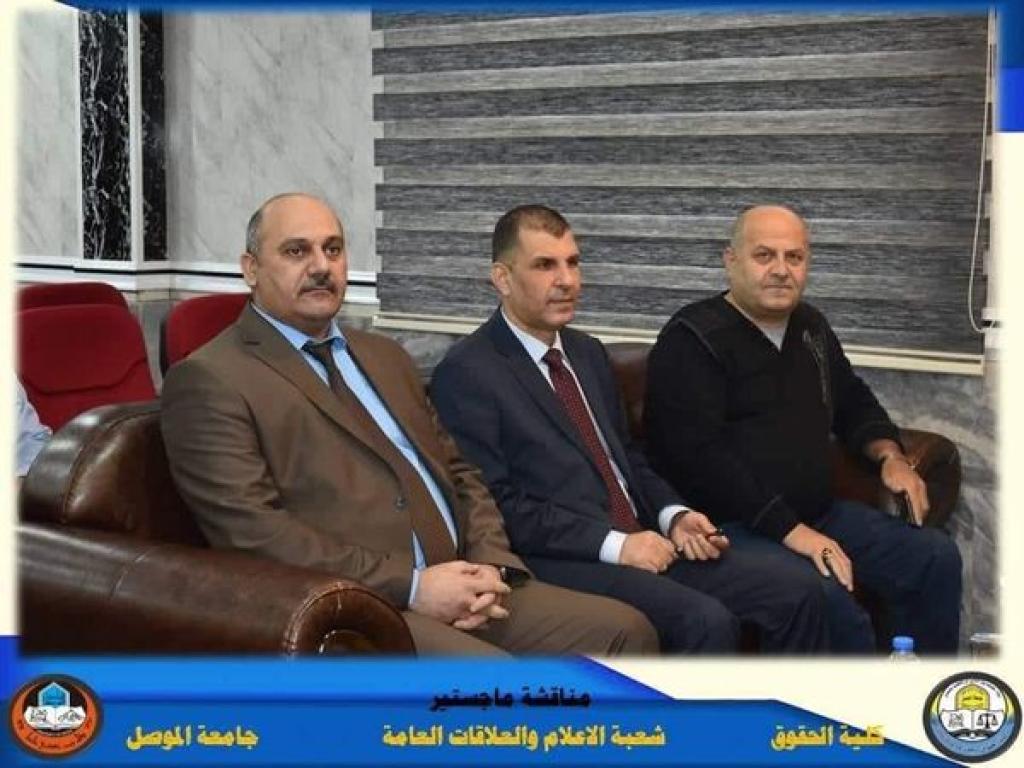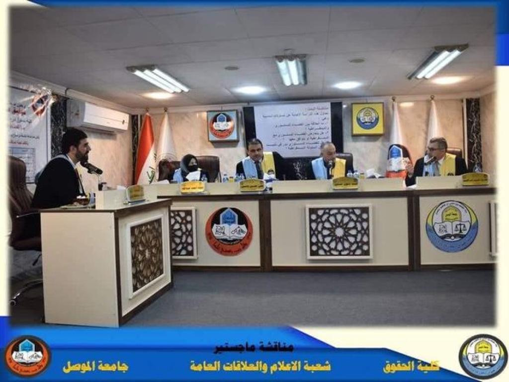 On Wednesday, October 26, 2022, the Public Law Branch at the College of Law at the University of Mosul discussed a master’s thesis on constitutional judiciary and democracy, part of which was attended by Assistant Professor Dr. Wissam Nemat Ibrahim Al-Saadi, Dean of the College and a number of members of the College Council and its teachers.