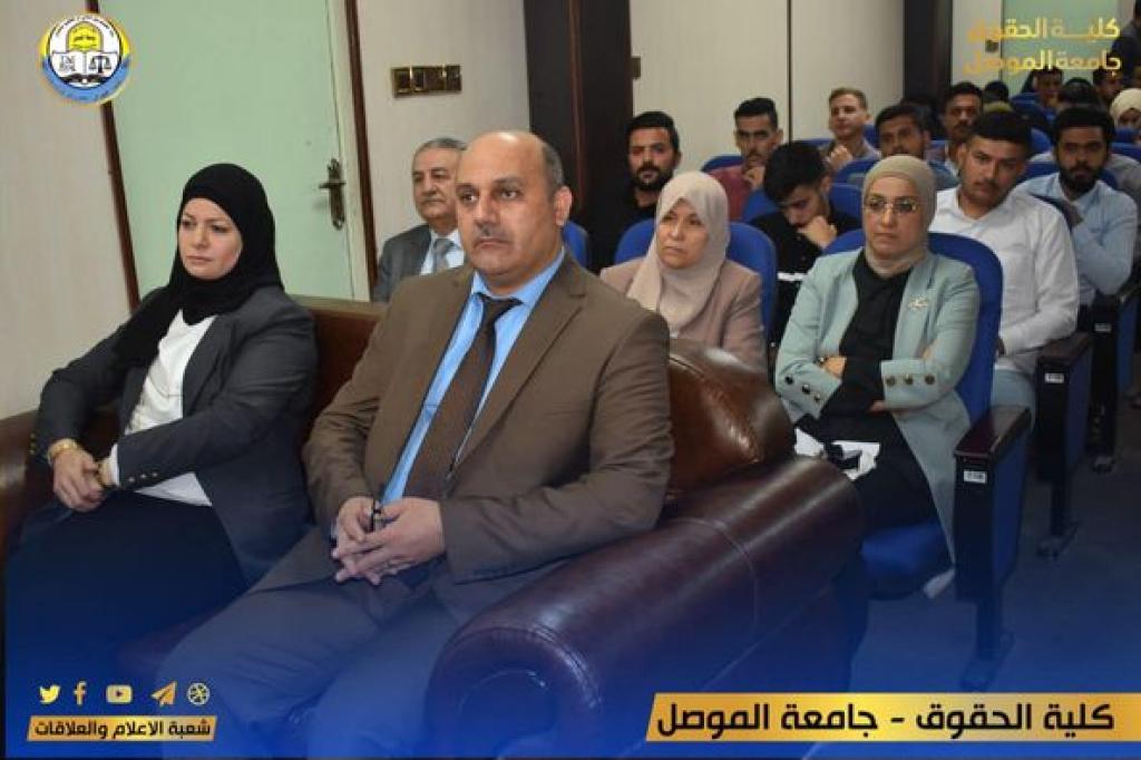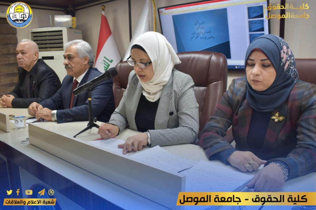 Under the patronage of Prof. Dr. Qusay Kamal Al-Din Al-Ahmadi, President of the University of Mosul, and under the supervision of Assistant Professor Dr. Wissam Nemat Ibrahim Al-Saadi, Dean of the Faculty of Law, and with the follow-up of Assistant Professor Dr. Qidar Abdul-Qader Saleh, Head of the Public Law Branch, the above branch held its scientific workshop on Thursday, October 27, 2022, labeled drug crimes and their impact On the youth, where Dr. Esraa Younis Hadi and Dr. Rana Abdel Moneim Yahya gave a scientific lecture in which they discussed the definition of narcotic substance, its types and causes Its spread and its health, social, psychological and legal effects and the position of the Iraqi legislator in the Penal Code No. 111 of 1969 and in the Narcotics and Psychotropic Substances Law No. 50 of 2017 and the forms of criminal behavior contained in the above drug law and the penalties and precautionary measures contained therein. The workshop witnessed a distinguished presence of researchers, academics and those interested in legal affairs. In addition to the faculty members, teachers and administrators, who asked many questions and inquiries about the topic of the workshop, which were answered in detail by the organizers.
