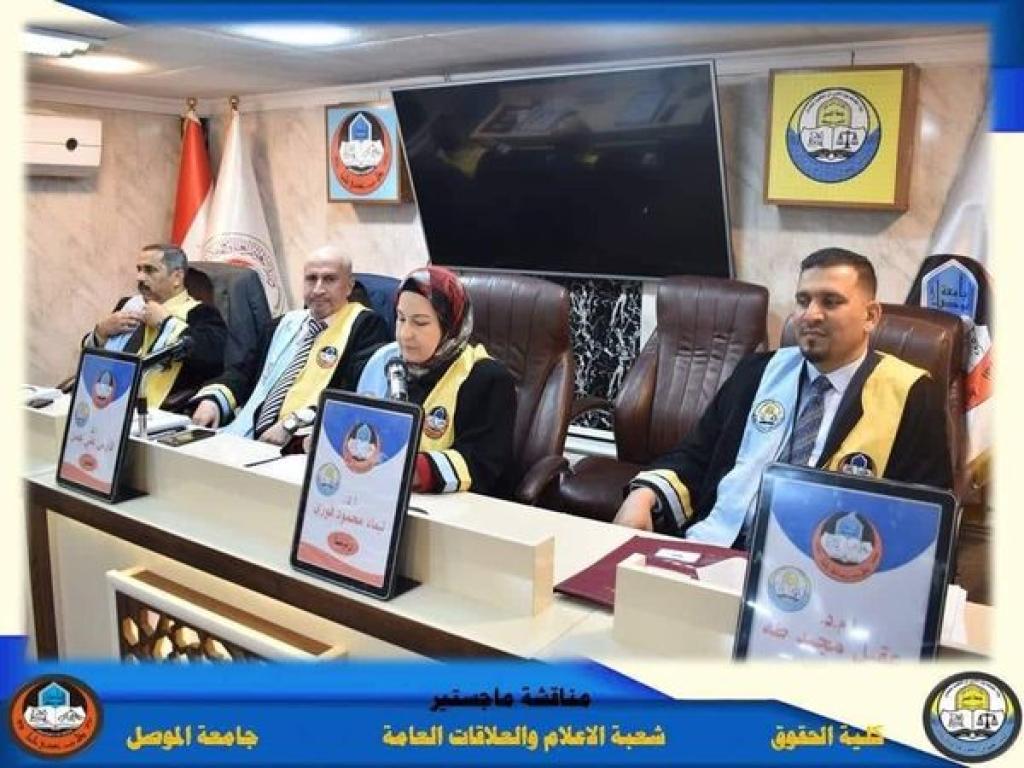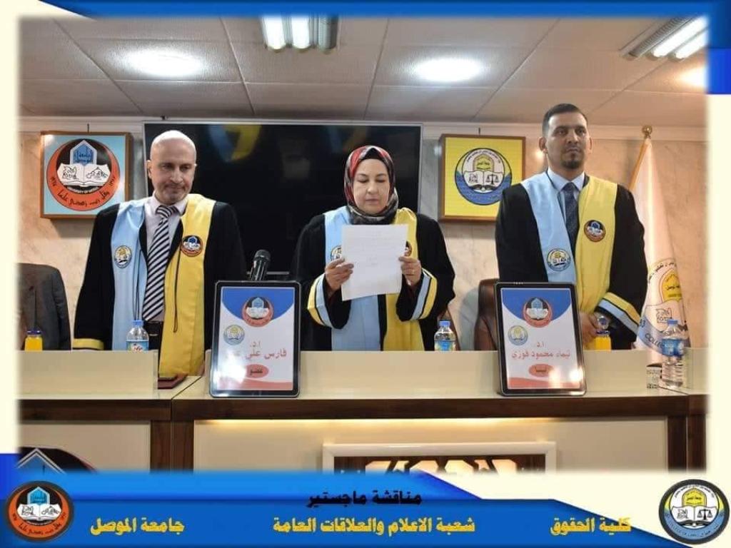 The discussion committee was chaired by Prof. Tayma Mahmoud Fawzy, with the membership of Prof. Faris Ali Omar, Assistant Professor Dr. Aqil Majid Taha, and the membership and supervision of Prof. Dr. Yasser Basem Thanoun.