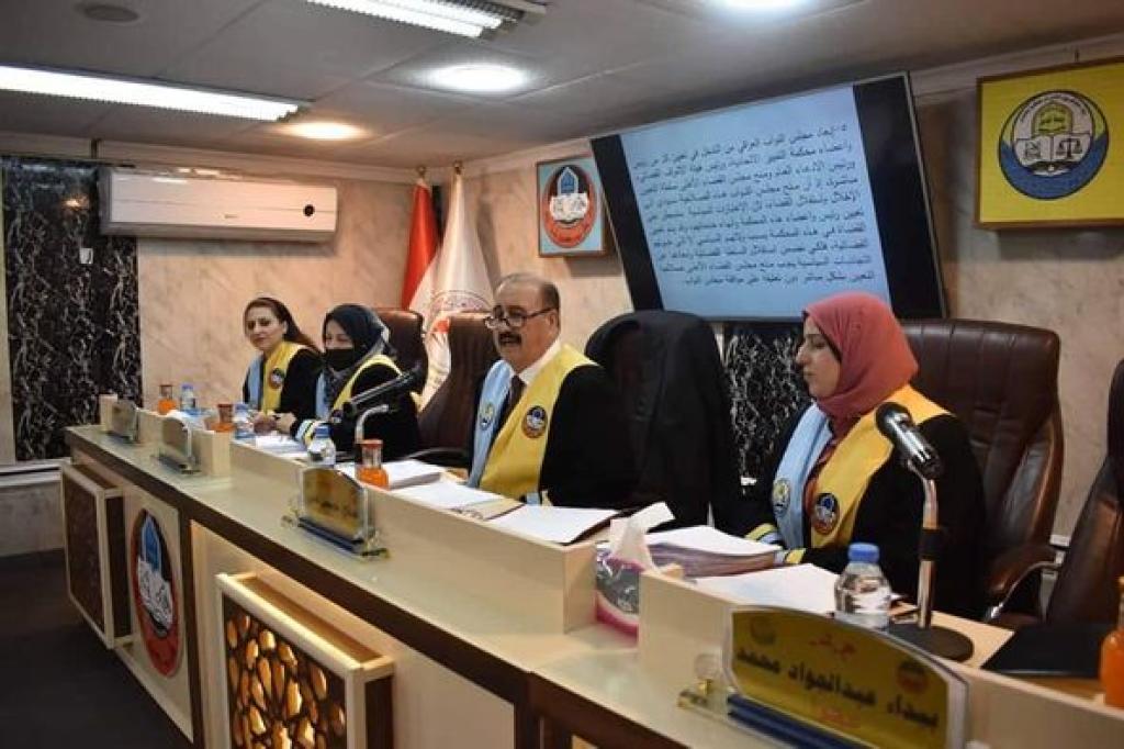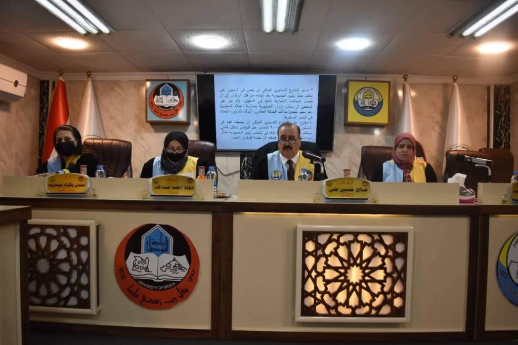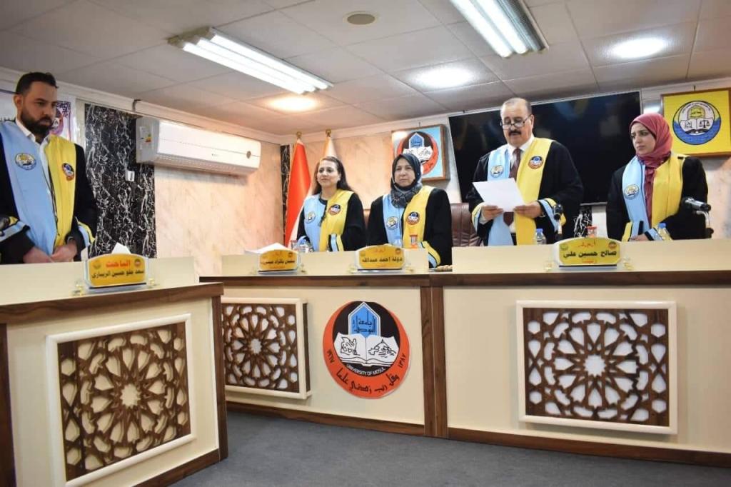 On Wednesday, November 9, 2022, the Public Law Branch at the College of Law at the University of Mosul discussed a master’s thesis on parliamentary decisions and their validity towards other authorities and independent bodies in Iraq. Part of it was attended by Assistant Professor Dr. Wissam Nemat Ibrahim Al-Saadi, Dean of the College, and Professor Dr. Khalaf Ramadan Muhammad, Associate Dean for Affairs. Administrative and financial, and a number of members of the college council and its teachers. The letter presented by the student Saad Mallo Hussein in the Public Law Branch dealt with the role of parliaments in political systems that are not limited to legislation, which is one of the functions practiced by parliament. independent.