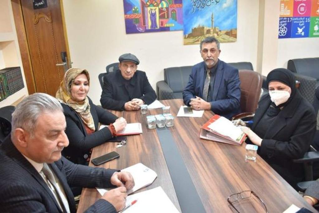 In the presence of the members of the College Council, Assistant Professor Dr. Wissam Nimat Ibrahim Al-Saadi, Dean of the Faculty of Law at the University of Mosul, met with Dr. Saba Khair Al-Din Al-Tai, Chairperson of the Sustainable Development Committee / Director of the Environment Research Center in the Presidency of the University of Mosul, where they discussed ways to achieve the seventeen goals of sustainable development in addition to the development program Also, ways to establish joint activities were reviewed, in addition to reviewing the activities of our college in the field of sustainable development. From scientific and academic advancement that contributes to the development of the process of construction, progress and prosperity in our dear college and our ancient university, our proud race.