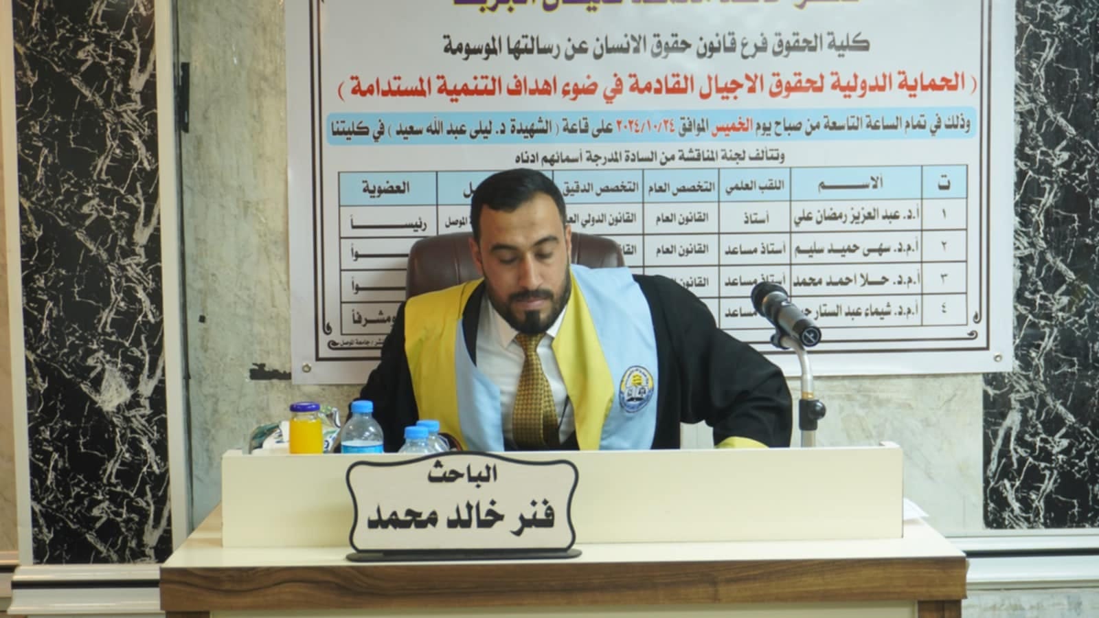 On Thursday, October 24, 2024, the Human Rights Law Branch at the College of Law at the University of Mosul discussed a master’s thesis on the international protection of the rights of future generations in light of the Sustainable Development Goals. Part of it was attended by Assistant Professor Dr. Wissam Nemat Ibrahim Al-Saadi, Dean of the College, and a number of members of the College Council and its instructors.