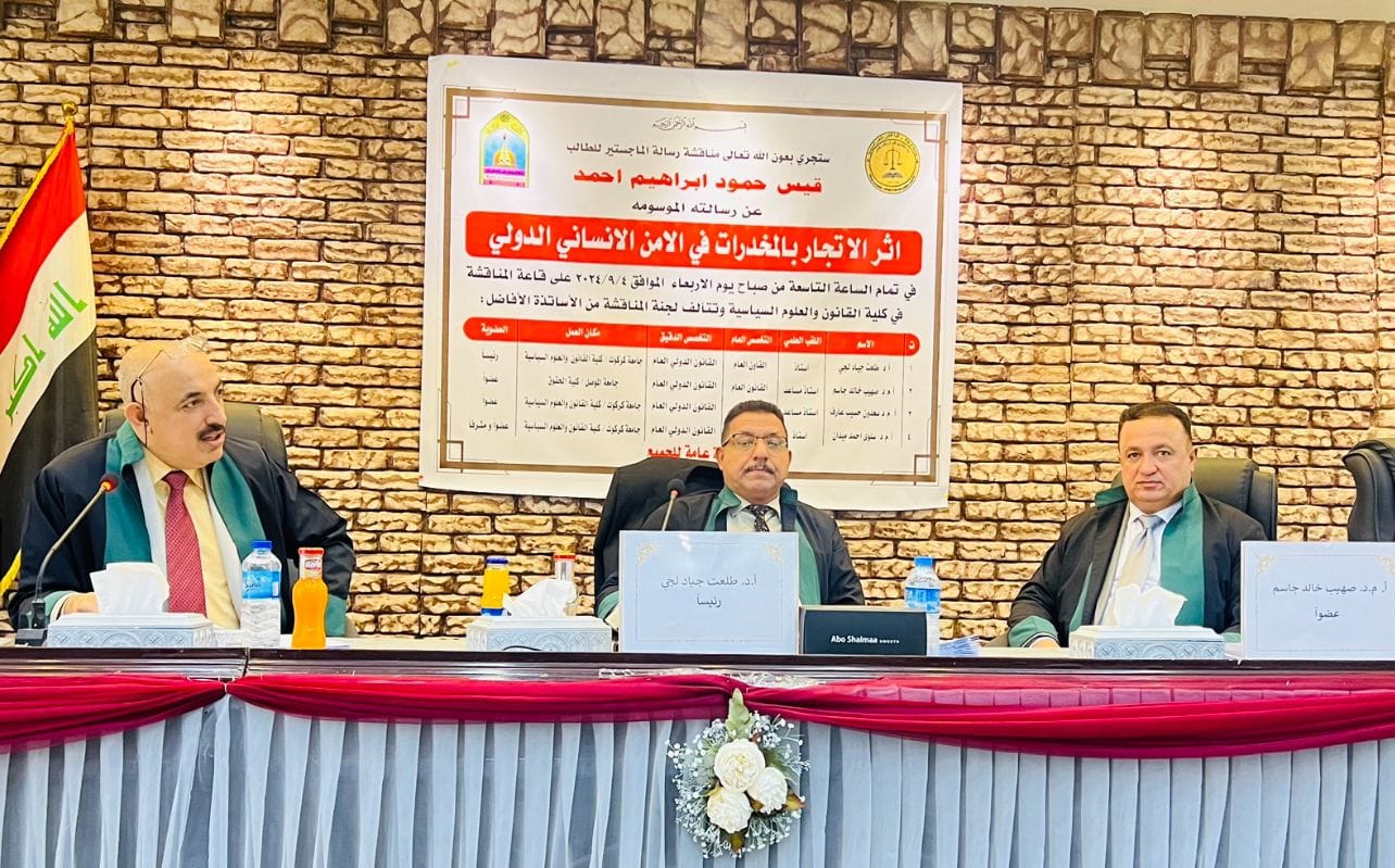 2024-09-12T05:37:23+00:00Assistant Professor Dr. Suhaib Khaled Jassim, one of the lecturers of the Human Rights Law Department at the College of Law at the University of Mosul, participated on Wednesday, September 4, 2024, in the membership of the committee to discuss the master's thesis entitled (The Impact of Drug Trafficking on International Human Security) for the researcher Qais Hamoud Ibrahim / College of Law and Political Science at the University of Kirkuk. The discussion committee approved the student's thesis as part of the requirements for obtaining a master's degree in public law. This participation expresses the scientific sobriety and prestigious academic standing [Read More]