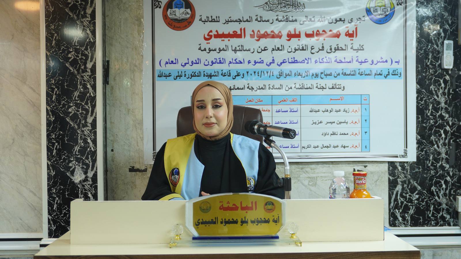 2024-12-18T08:34:36+00:00Master's thesis in the Public Law Department on the legality of artificial intelligence weapons in light of the provisions of international public law,,, The Public Law Department at the College of Law at the University of Mosul discussed on Wednesday, December 4, 2024, a master's thesis on the legality of artificial intelligence weapons in light of the provisions of international public law, attended by Assistant Professor Dr. Wissam Nemat Ibrahim Al-Saadi, Dean of the College, and a number of members of the College Council and its lecturers. The thesis submitted by researcher Aya Mahjoub Balo in the Public Law Department addressed [Read More]