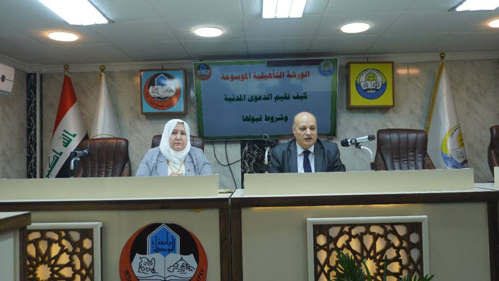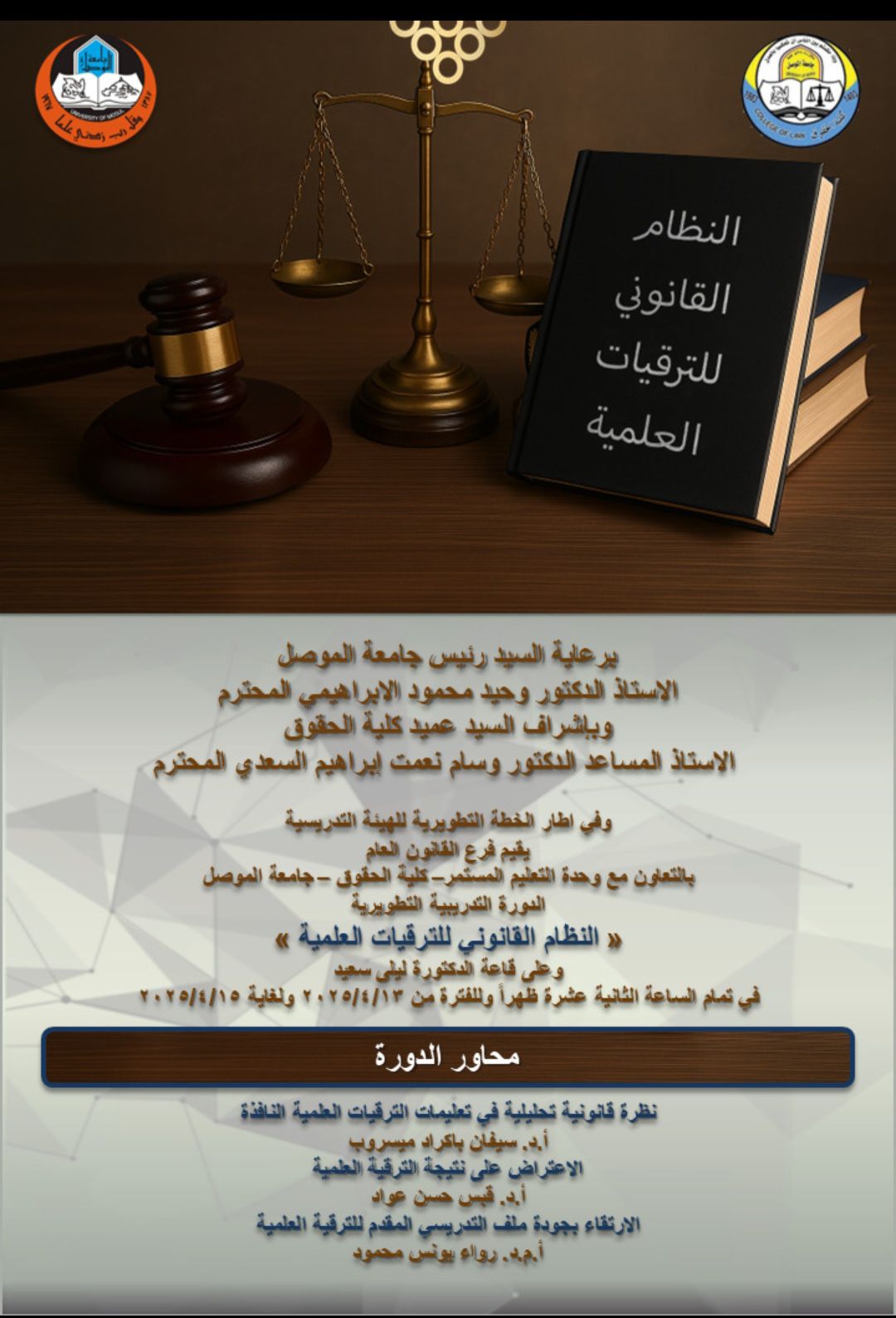 Under the patronage of Professor Dr. Wahid Mahmoud Al-Ibrahimi, President of the University of Mosul, and under the supervision of Assistant Professor Dr. Wissam Nemat Ibrahim Al-Saadi, Dean of the College of Law, and within the framework of the faculty development plan, the Public Law Department, in cooperation with the Continuing Education Unit, will hold a developmental training course entitled “The Legal System for Academic Promotions” from April 13-15, 2025, at 12:00 PM for the above period in the hall of the martyr Dr. Laila Abdullah Saeed