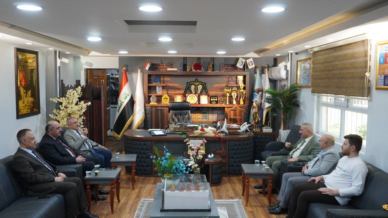 Visit of the Assistant President of the University of Nineveh for Administrative Affairs to the College of Law at the University of Mosul. On Tuesday, April 15, 2025, Assistant Professor Dr. Wissam Nemat Ibrahim Al-Saadi, Dean of the College of Law at the University of Mosul, received Professor Dr. Ammar Saadoun Hamid Al-Mashhadani, Assistant President of the University of Nineveh for Administrative Affairs. Al-Mashhadani visited our college and offered his best congratulations to the College of Law and the University of Mosul on the occasion of its fifty-eighth anniversary celebrations, as well as on the occasion of receiving institutional accreditation from the Ministry of Higher Education and Scientific Research. He praised the exceptional relationship between the Universities of Mosul and Nineveh, highlighting the importance of cooperation between the two academic institutions in Mosul and their shared role in advancing scientific progress and cognitive prosperity in the land of Mesopotamia. For its part, the Deanship of the College of Law honored its dear guest with the Loyalty Shield in appreciation of his role and commending his distinguished academic and research efforts, which have had a remarkable impact and lasting impact in Mosul. The meeting was attended by several members of the College of Law Council and its faculty members.