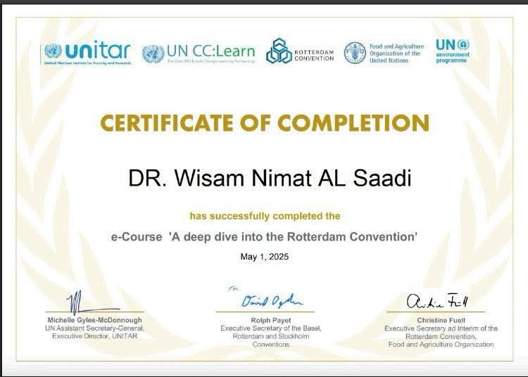 As part of the United Nations Institute for Training and Development (UNITAD) programs, and in cooperation with the United Nations Environment Programme (UNEP), the Food and Agriculture Organization of the United Nations (FAO), the Conference of the Parties to the Paris Agreement on Climate Change, and the Secretariat of the Rotterdam Convention on Hazardous Chemicals, Assistant Professor Dr. Wissam Nemat Ibrahim Al-Saadi, a lecturer in the Public Law Department at the College of Law at the University of Mosul, participated in a specialized training and development program. The tremendous growth in the production and trade of chemicals over the past decades has raised concerns about the potential risks posed by hazardous chemicals, especially for countries that lack adequate infrastructure to monitor the import and use of chemicals, leaving them vulnerable. In response to these concerns, the Rotterdam Convention on the Prior Consent Procedure for Trade in Certain Hazardous Chemicals and Pesticides in International Trade was adopted in 1998 and entered into force in 2004. The Convention aims to promote shared responsibility and cooperative efforts among parties in international trade of certain hazardous chemicals to protect human health and the environment from potential harm and contribute to their environmentally sound use. The above course is offered. An in-depth learning experience that systematically covers the mechanisms and provisions of the Convention and explores in detail the key concepts and processes.