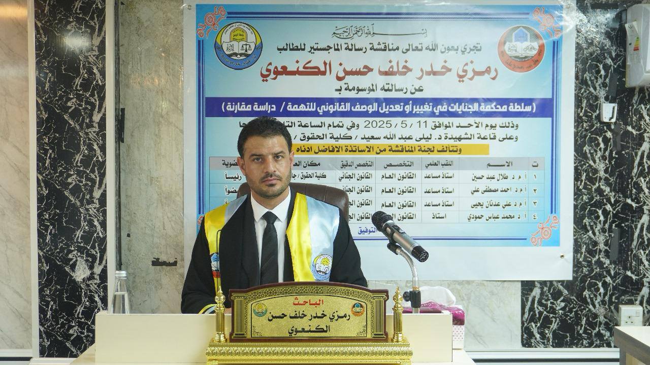 On Sunday, May 11, 2025, the Public Law Department at the College of Law at the University of Mosul discussed a Master’s thesis on the Authority of the Criminal Court to Change or Amend the Legal Description of a Charge / A Comparative Study. Professor Dr. Abdulaziz Ramadan Ali, Dean of the College of Law, and several members of the College Council and faculty members attended the discussion.