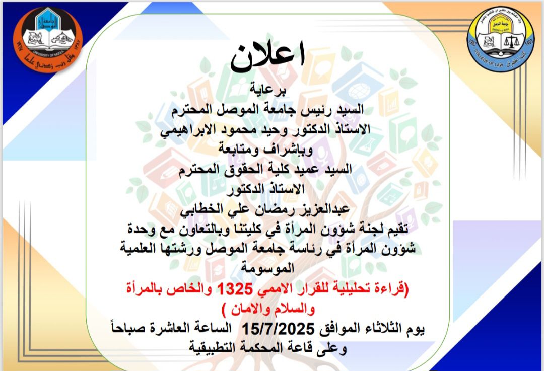 Under the patronage of Professor Dr. Wahid Mahmoud Al-Ibrahimi, President of the University of Mosul, and under the supervision of Professor Dr. Abdulaziz Ramadan Ali, Dean of the College of Law, the Women’s Affairs Committee at our college, in cooperation with the Women’s Affairs Unit at the University of Mosul Presidency, will hold a scientific workshop entitled “An Analytical Reading of UN Resolution 1325 on Women, Peace, and Security” at 10:00 a.m. on Tuesday, July 15, 2025, in the Applied Court Hall.