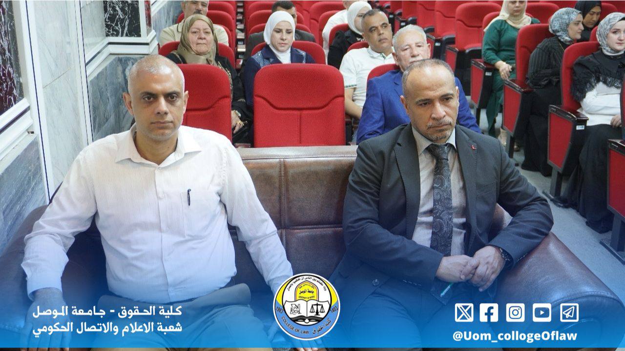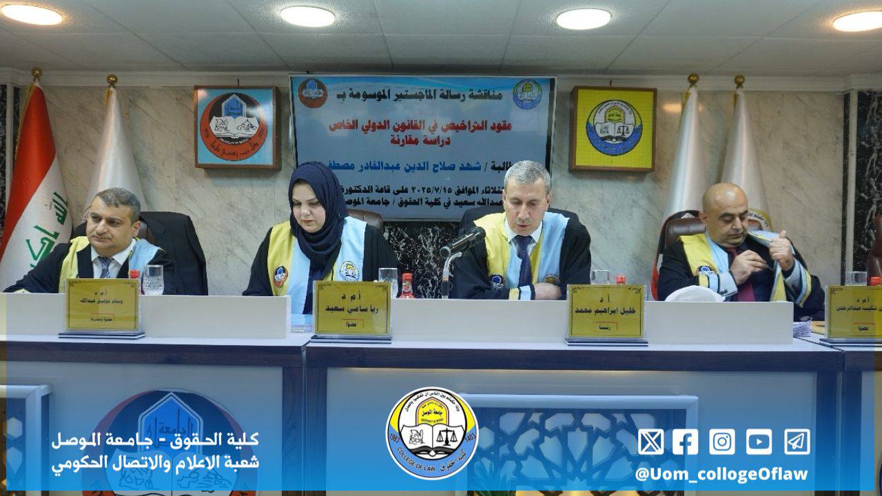 On Tuesday, July 15, 2025, the Private Law Department at the College of Law at the University of Mosul discussed a master’s thesis on Licensing Contracts in Private International Law/A Comparative Study. Professor Dr. Abdulaziz Ramadan Ali, Dean of the College, and several members of the College Council and faculty members attended the discussion.