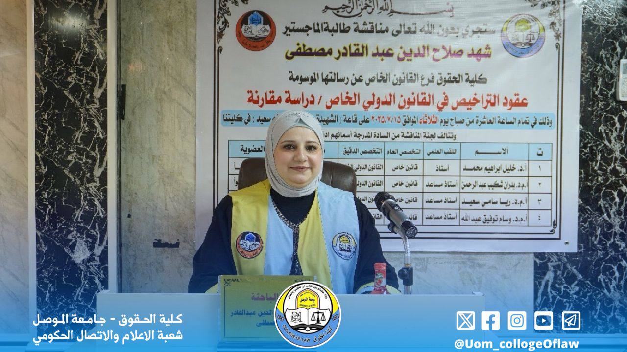 The thesis, submitted by student Shahd Salah al-Din Abdul Qadir in the Private Law Department, addressed the concept of licensing contracts, which play a pivotal role in the transfer of technology between countries, particularly from developed to developing countries. The thesis also highlighted the obligations arising from the above-mentioned contracts and their distinguishing characteristics, as well as their legal nature.