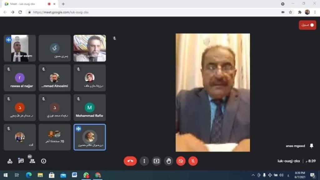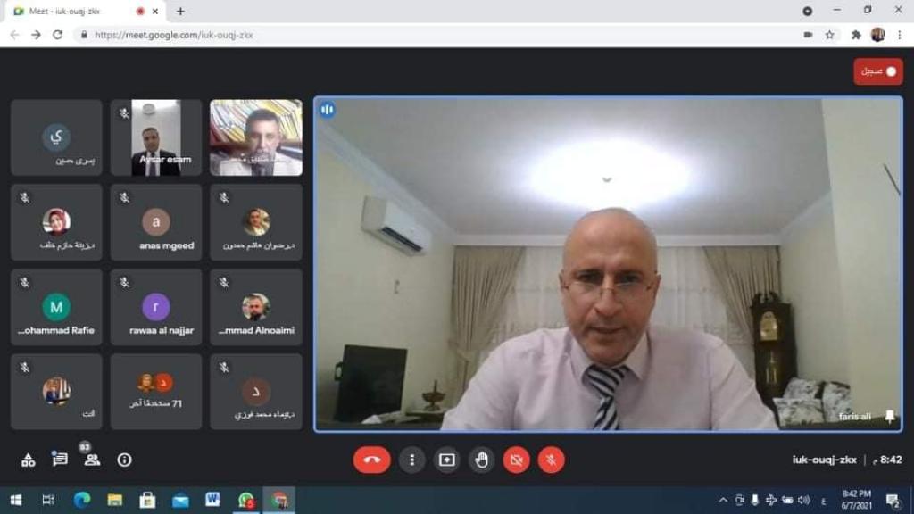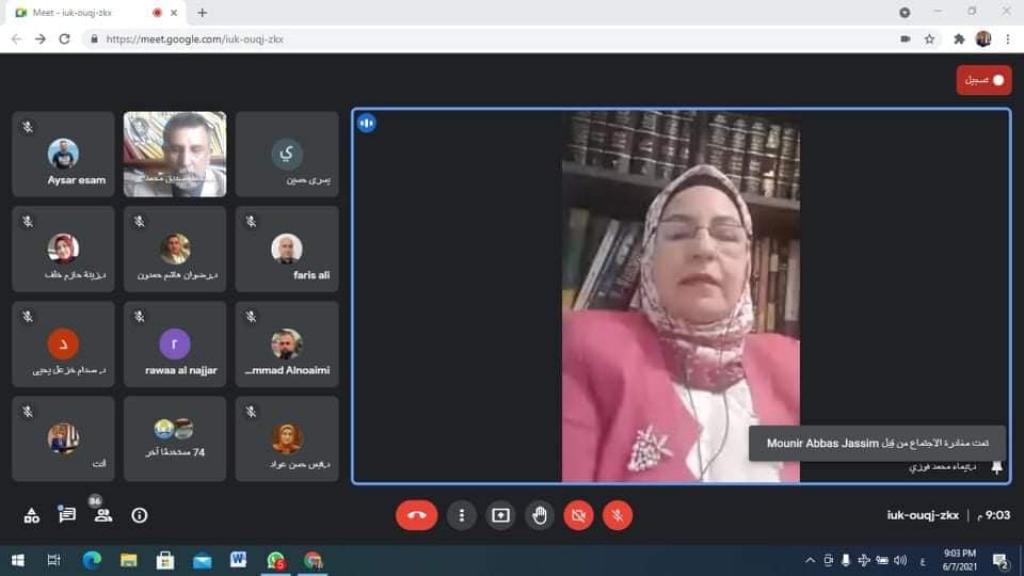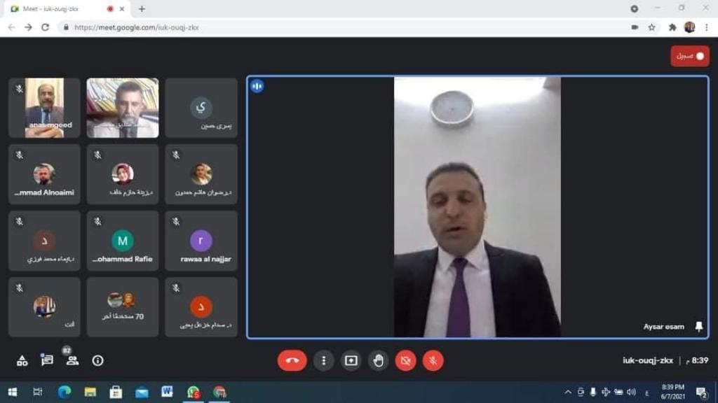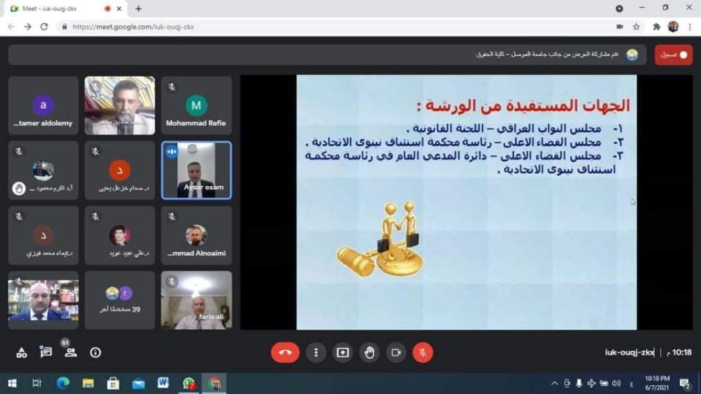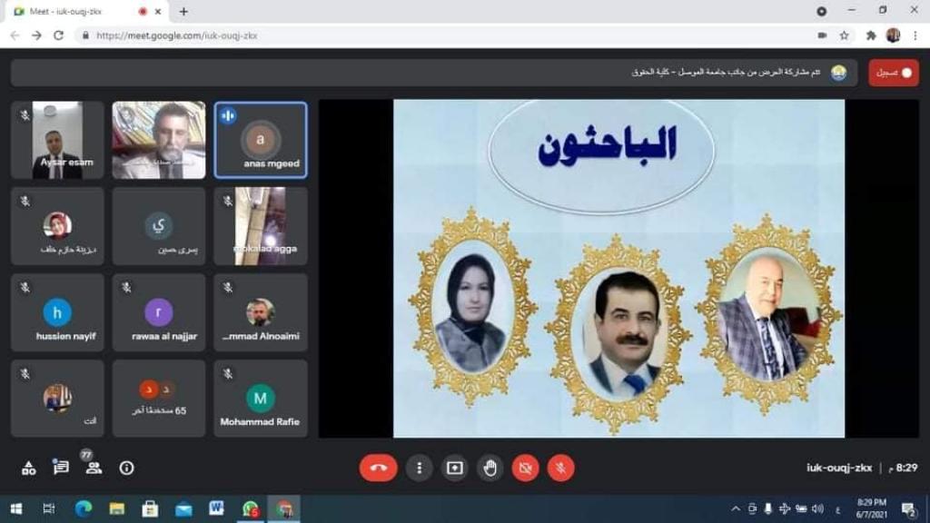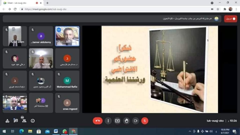 Under the patronage of Prof. Dr. Qusay Kamal Al-Din Al-Ahmadi, President of the University of Mosul, under the supervision of Assistant Professor Dr. WissamNemat Ibrahim Al-Saadi, Dean of the Faculty of Law at the University of Mosul, and with the follow-up of Assistant Professor Dr. AjyadThamerNayef, Head of the Private Law Branch, and under the direction of Assistant Professor Dr. Muhammad Siddiq Muhammad Abdullah, and the decision of Assistant Professor Dr. AyserEssamDaoud On Monday, June 7, 2021, the above branch held, via electronic platforms, a scientific workshop entitled (The Role of the Public Prosecution in the Civil Case under the New Public Prosecution Law)