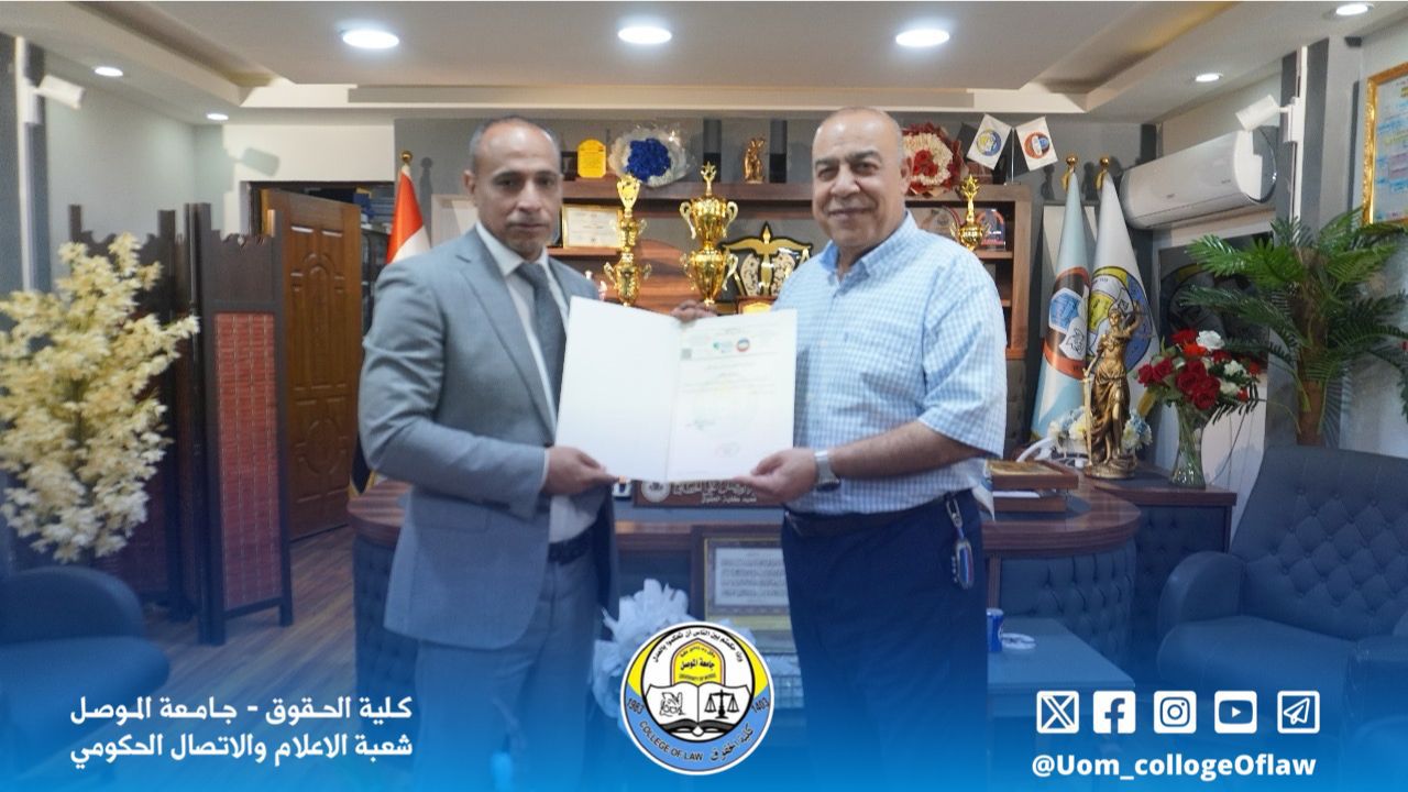 ruaahukmat2025-06-11T08:28:58+00:00Professor Dr. Ajyad Thamer Nayef, a lecturer in the Private Law Department at the College of Law at the University of Mosul, was honored with a letter of thanks and appreciation from the college's deanship for donating a valuable collection of his scholarly works on civil procedure and evidence to the College of Law library.