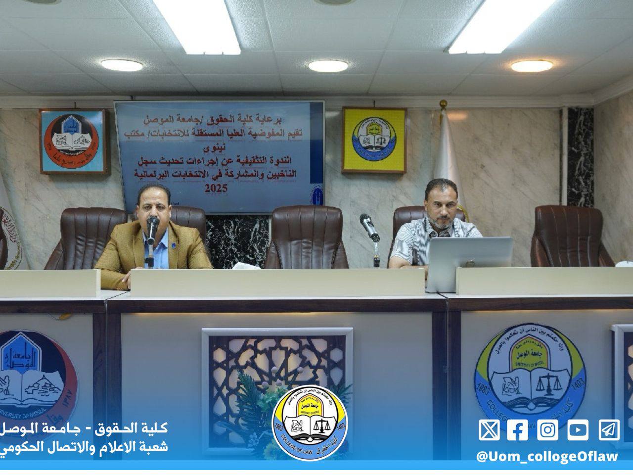 ruaahukmat2025-06-11T08:40:10+00:00workshop on updating voter data. On Monday, May 26, 2025, the College of Law at the University of Mosul hosted a number of employees from the Independent High Electoral Commission in Nineveh Governorate. The lectures addressed electoral registration, updating voter data, and issuing electoral cards, enabling voters to exercise their right to vote and choose their representatives in local councils and parliament. The lecturers also provided an explanation of the data contained in the electoral card. They also noted that registration in the electoral register is available to citizens year-round, and clarified the cases in which citizens are permitted to update [Read More]