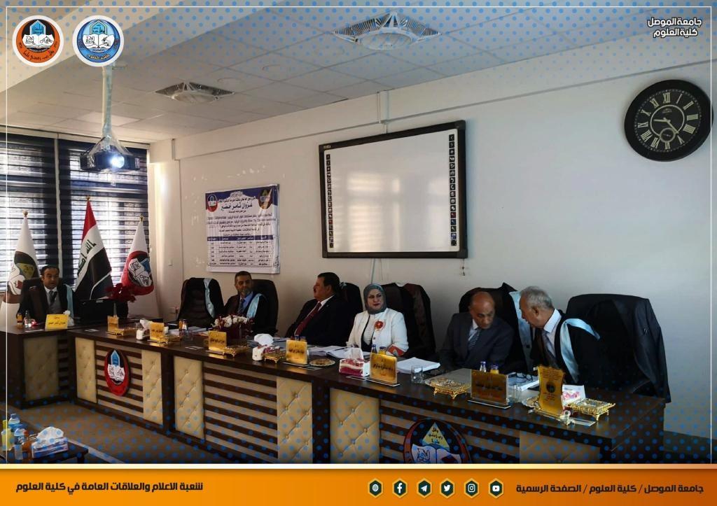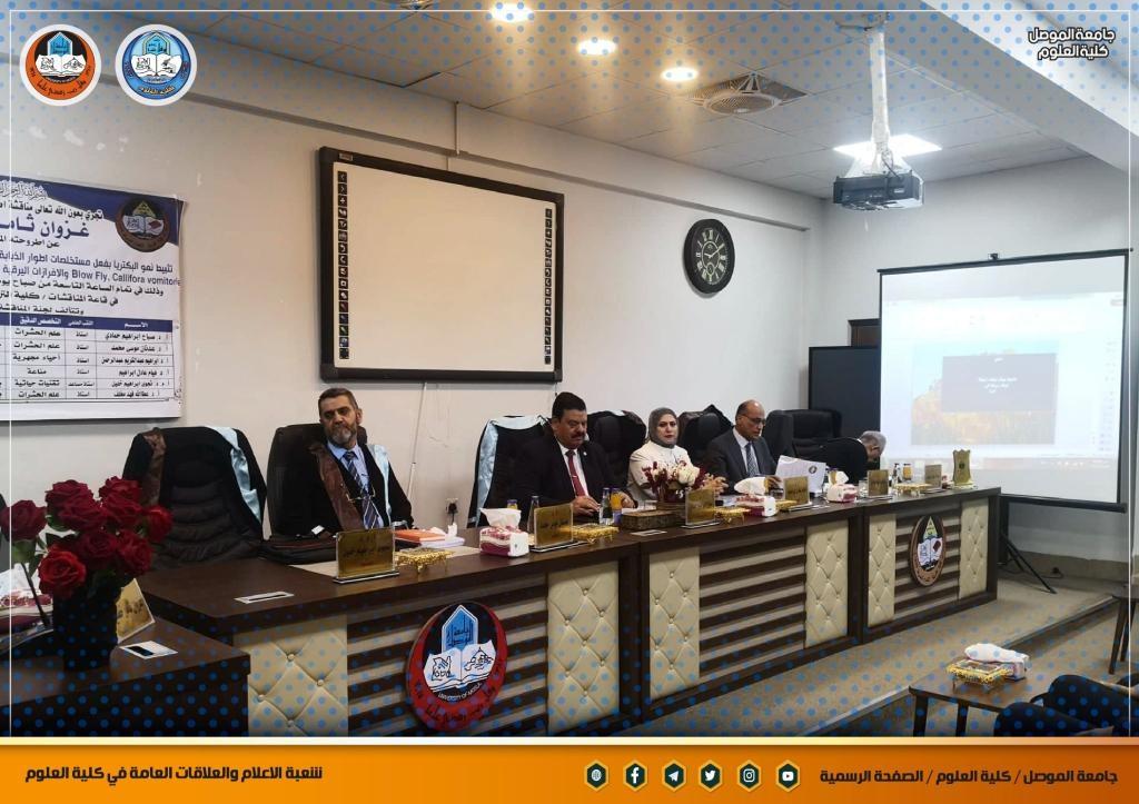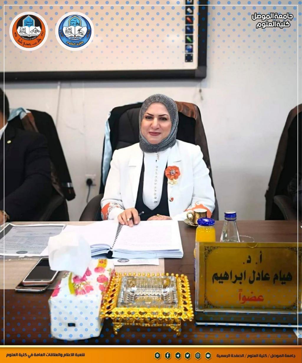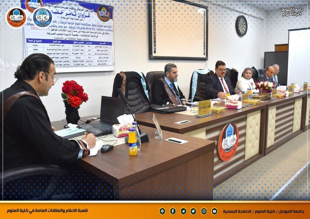 Ms. Dean of the Faculty of Science, Prof. Dr. Hiyam Adel Ibrahim, a respected professor, participated in the committee discussing PhD thesis of the student (Ghazwan Thamer Khudhair al-Rashidi) from the Department of biology / Faculty of Education for Pure Sciences / Mosul University.The committee was chaired by Professor Dr. Sabah Ibrahim Hammadi, President of Fallujah University, and the thesis, which was attended by The President of Mosul University, Dr. Qusay Kamal al-Din al-Ahmadi, distinguished Professor Dr. Munir Salem Taha, and a number of faculty teachers, were named “Inhibiting the growth of bacteria by blow fly emergency extracts, Calliphora vomitoria (Diptera: Calliphoridae) and larval secretions, with the separation and diagnosis of effective compounds.”It took place on the morning of Tuesday, July 5, 2022, in the faculty’s discussion room.Our wishes to the college members for success and lasting giving.
