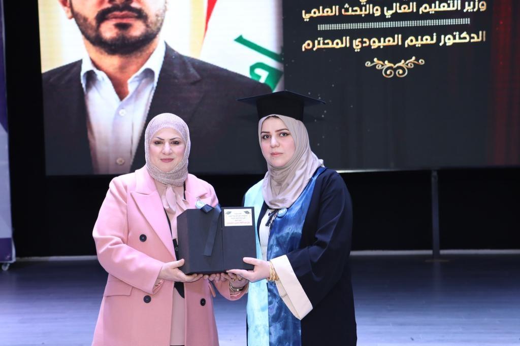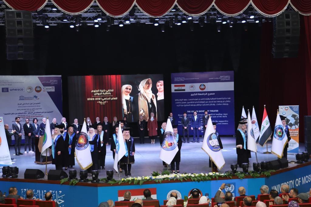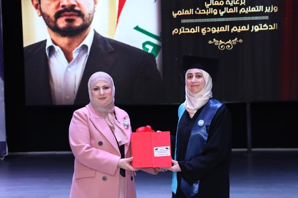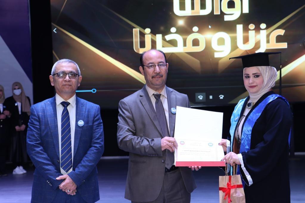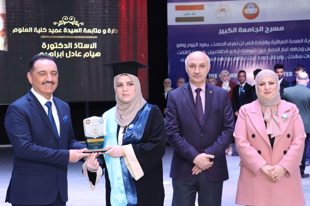 Under the auspices of the Minister of Higher Education and Scientific Research, Dr. Naeem Al-Aboudi, in the presence and supervision of the president of Mosul University, Professor Dr. Qusai Kamal Al-Din Al-Ahmadi and the Dean of the Science College, Professor Dr. Hiyam Adel Ibrahim.The Deanship of Science College has organised a ceremony on the 21st of December in the hall of the Grand Theater of the University of Mosul to honour the top-ranked students of the fourth stages in the college for the academic year 2021-2022 and to welcome the new students who joined our college this year.The top-ranked students were congratulated on their achievement by providing them with a certificate of appreciation for their efforts and supporting them to continue with success and excellence.