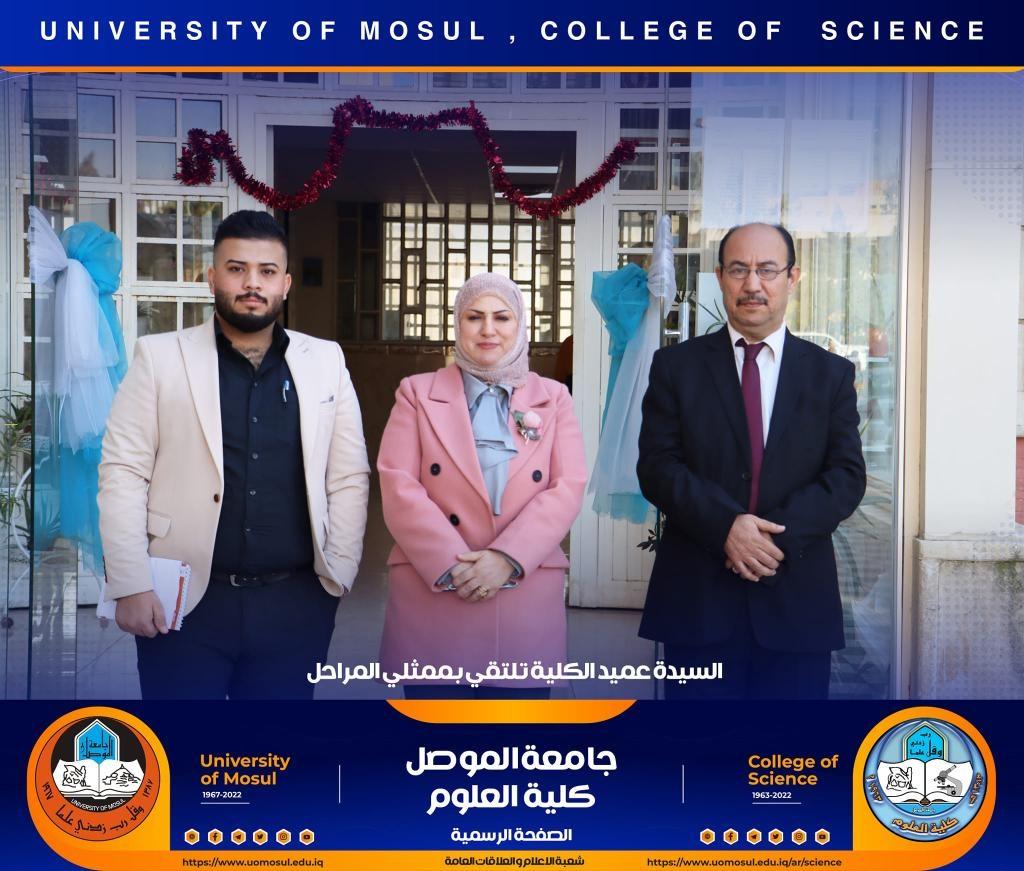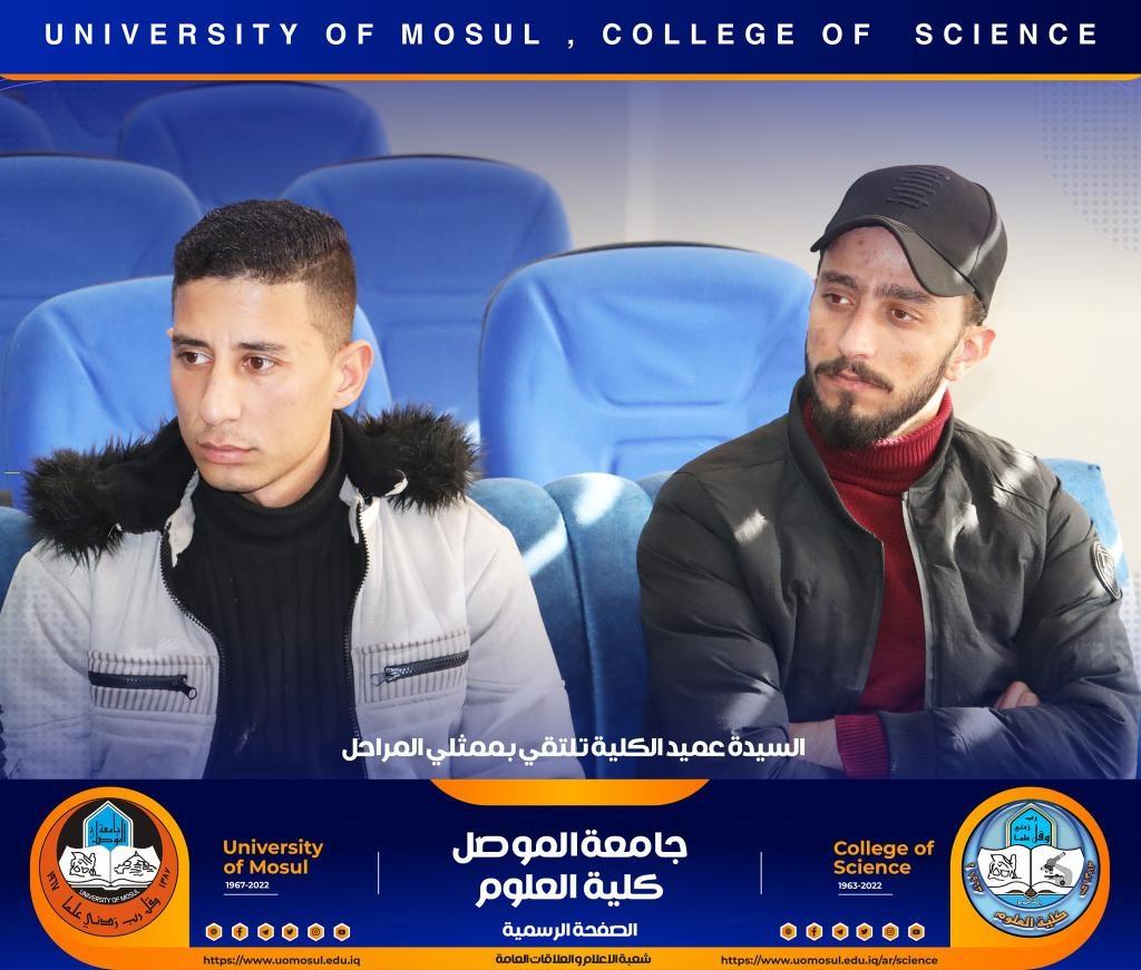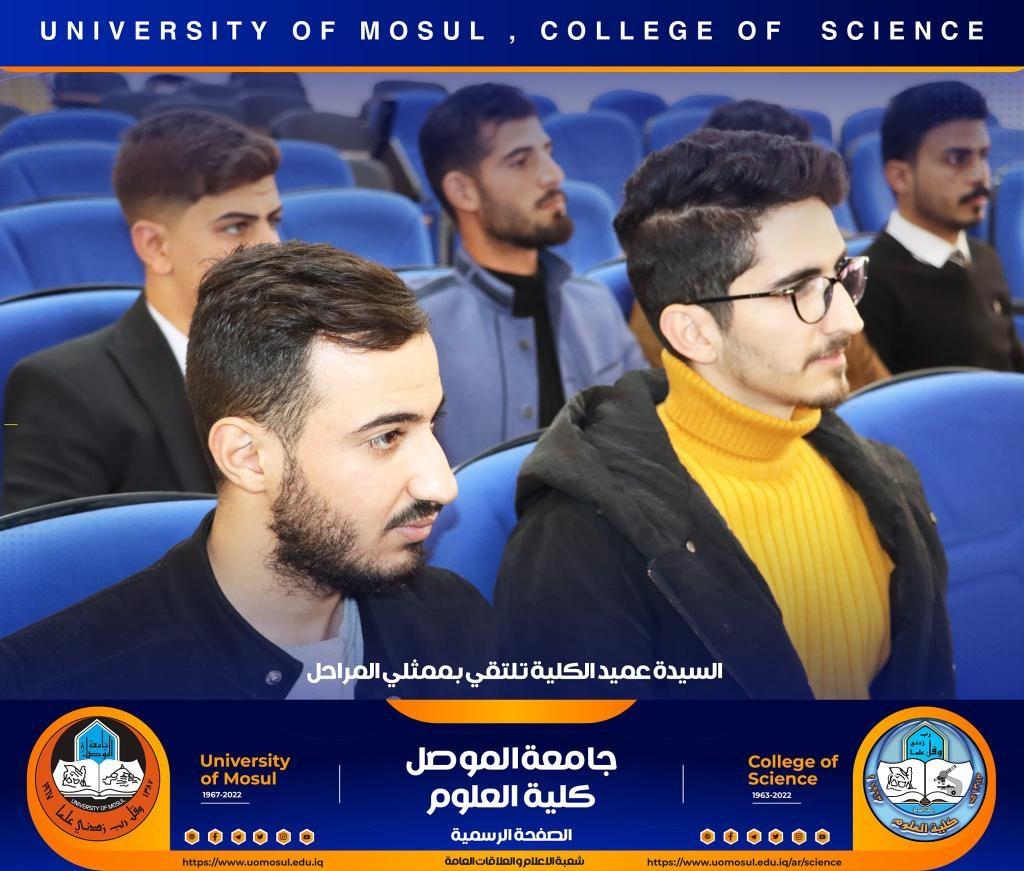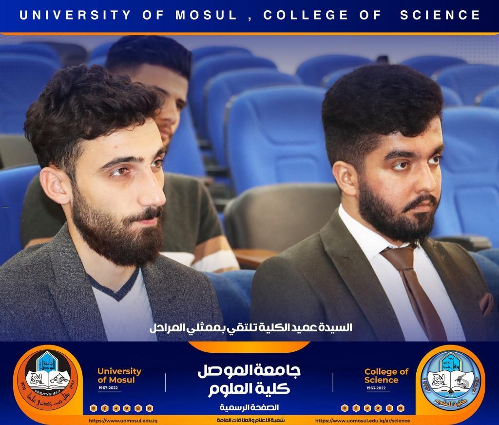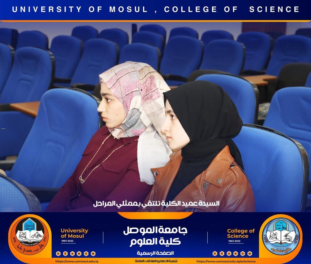 The Dean of the Faculty of Science, Prof. Dr. Hiyam Adel Ibrahim, met with representatives of the stages of the college’s departments on Wednesday, the 28th of December 2022, in the Chemistry Department.During the meeting, emphasis was placed on the commitment to the instructions and timings related to final exams and the need to urge students to actively participate in the scientific, cultural and sports activities held by the college. The Dean also listened to the most prominent obstacles facing students and ways to overcome and solve them.