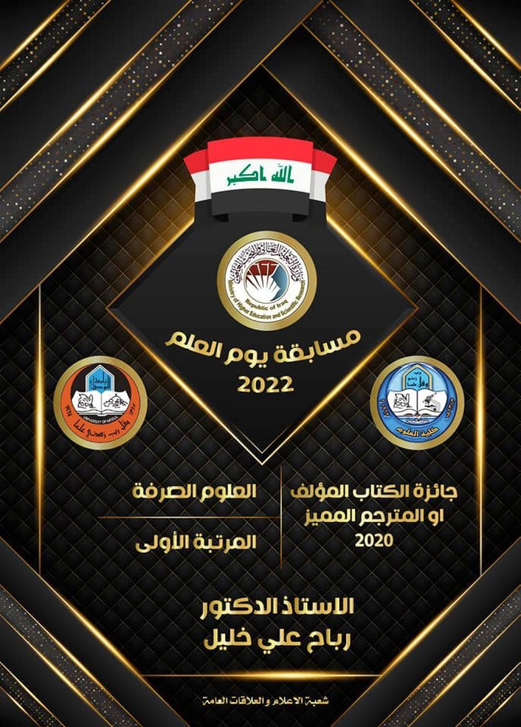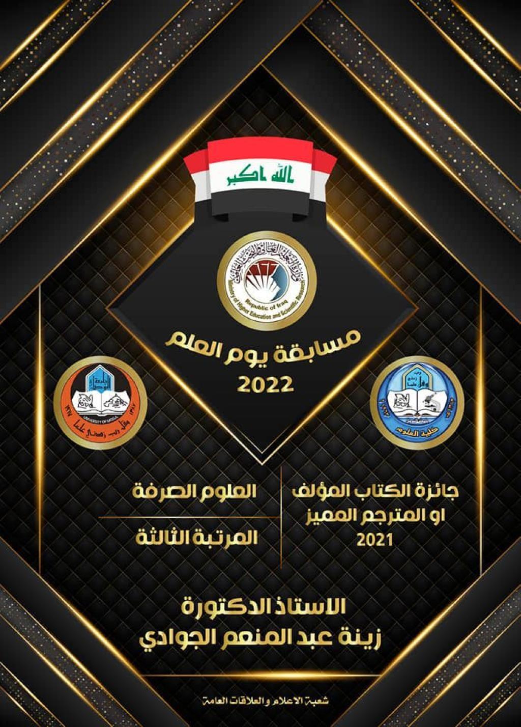 The University of Mosul ranked first among Iraqi universities, and the College of Science ranked first among the University of Mosul colleges, jointly with the College of Veterinary Medicine, with (5 prizes) in the Science Day 2022 competition announced by the Ministry of Higher Education and Scientific Research. The College of Science won five awards distributed to various categories in the competition as follows:1- Distinguished Patents and Intellectual Property Award:- The first place (publication year, 2020) went to Prof. Dr. Amira Mahmoud Muhammad Al-Rawi from the Department of Biology.- The second place (publication year, 2021) was won by Dr. Ahmed Mounir Suhail from the Department of Physics.1- Distinguished Author or Translator Book Award:-The first place (publication year, 2020) was won by Prof. Dr. Rabah Ali Khalil from the Department of Chemistry.- The first place (publication year, 2021) was won by Dr. Mahmoud Zaki Suleiman Al-Hasso/Assistant Professor from the Department of Medical Physics.- The third place (publication year, 2021) was obtained by Prof. Dr. Zina Abdel Moneim Al-Jawadi from the Department of Chemistry.In turn, the family of the College of Science, represented by the Dean, Prof. Dr. Hayam Adel Ibrahim, extends its warmest congratulations to the distinguished members of our college who had a distinguished presence in scientific research at the level of Iraqi universities, wishing them all the best in serving our country.