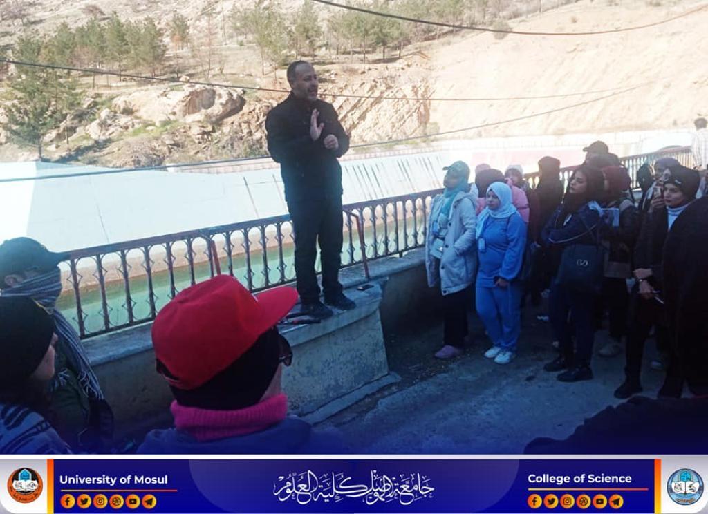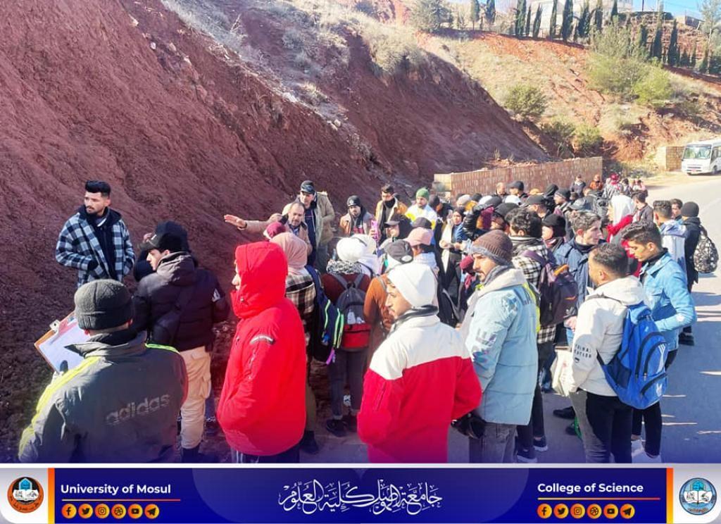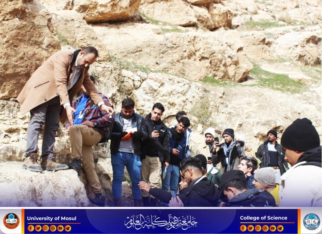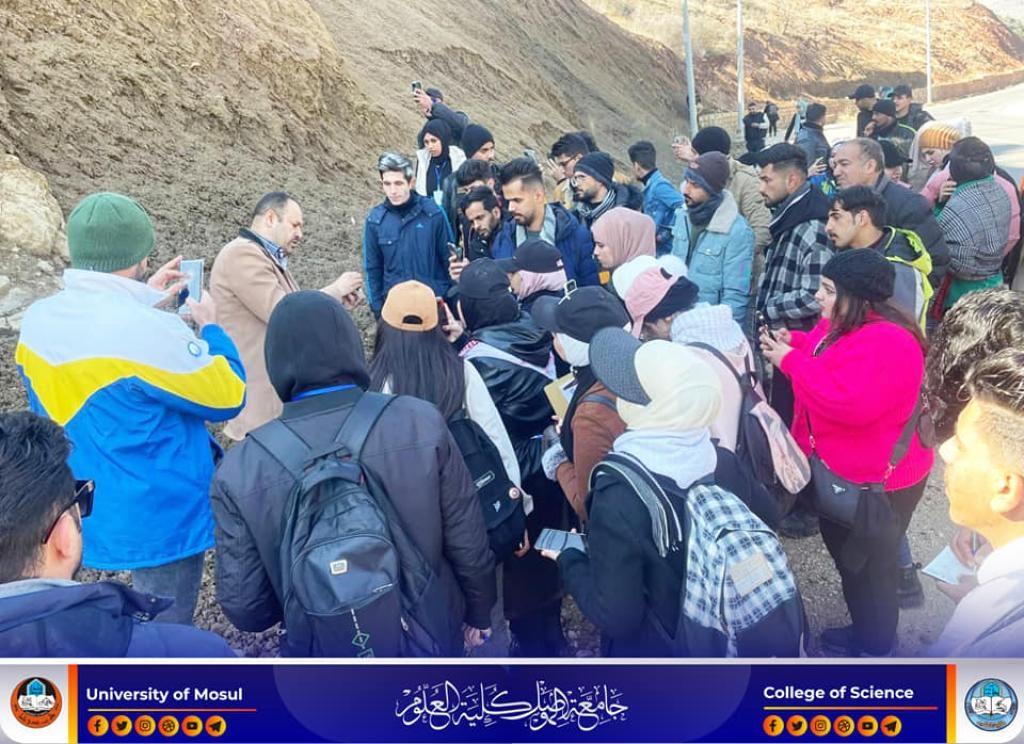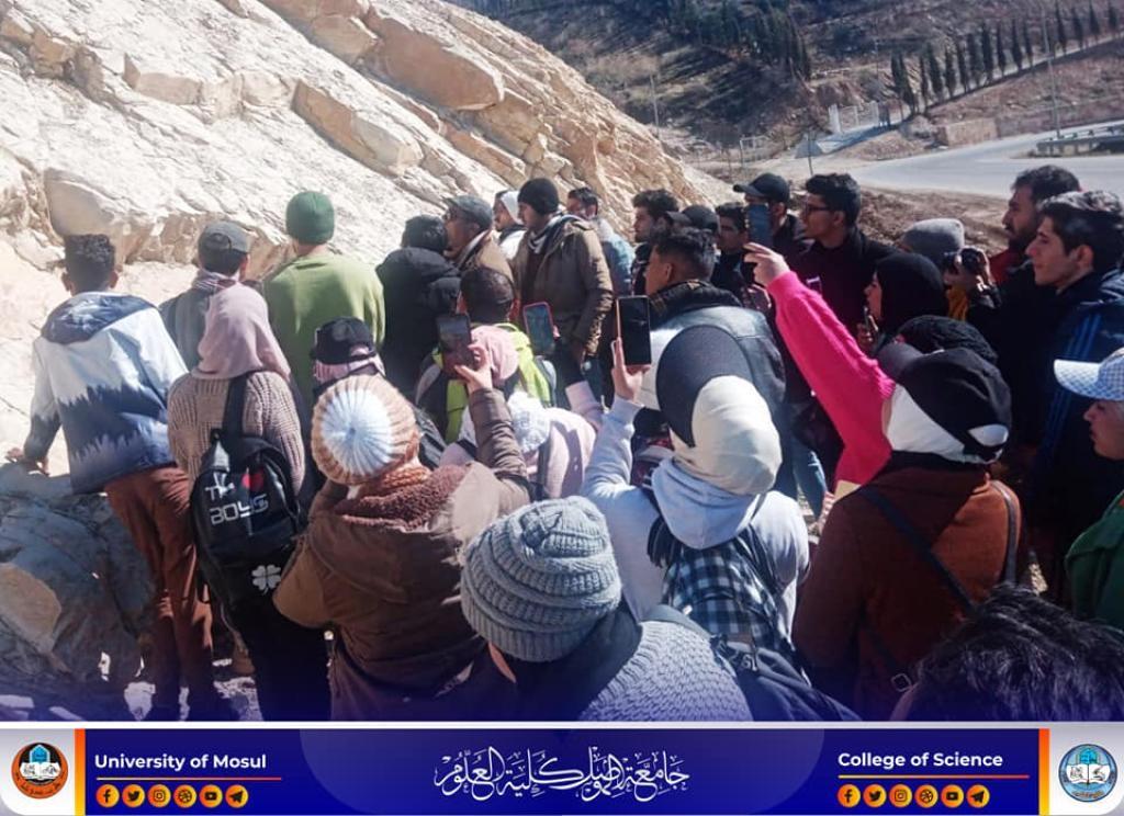 As a part of the scientific cooperation between the Iraqi universities, an academic staff group from the Department of Geology in our College, represented by Dr. Falah Abd Al-Mamaari, Dr. Mahfoud Abdullah Al-Hadidi, Dr. Mahmoud Abd Al-Haqq Al-Sumaidi, and Izzat Ibrahim Khadr, accompanied the students of the College of Remote Sensing at the Al-Karkh University of Science in a field trip to the Bakhir anticline in the Dohuk Governorate, on Monday, the 13th of February, 2023. The field trip included an introduction to the nature of the Bekher fold and its stratigraphic sequence.