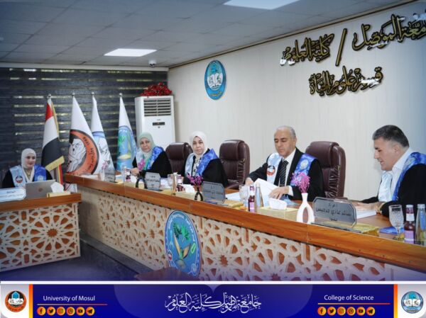 The Department of Biology at the College of Science – University of Mosul discussed the master thesis tagged “diagnosis of bacteria isolated from cases of bacteremia and inhibition of gene expression of anti-flux genes of the most isolated bacteria” on Tuesday, September 16, 2025, in the presence of the head of the Department, Professor Dr. Amjad Abdul Hadi and a number of teaching and graduate students.