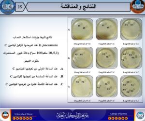 Student Rasliya Yunus Mahmoud Ahmed from the microbiology branch presented an integrated study focused on revealing the ability of Klebsiella pneumoniae strains to produce signal molecules within the Quorum Sensing (QS) phenomenon, in addition to investigating the effect of different concentrations of vitamin C in inhibiting the production of these molecules through the Quorum Quenching (QQ) phenomenon. The study also for the first time locally adopted the PFGE technique to determine the genetic relationship between strains and the source of infection.