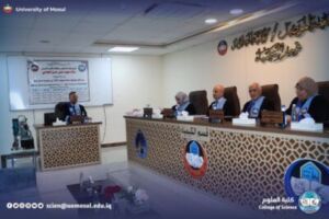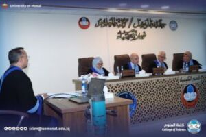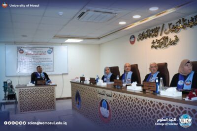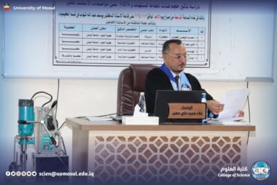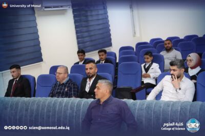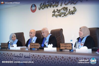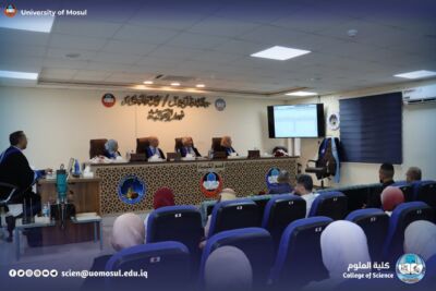 Part of the discussion was attended by the dean of the College of Science Prof. Dr. Hiyam Adel al-Taie, Mr. administrative assistant Prof. Dr. Omar Adel Sharif, the Honorable Mr. head of the Department of Chemistry Prof. Dr. Salem Jassim, in addition to a number of department teachers and graduate students.