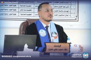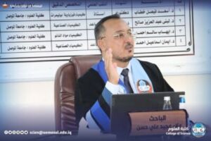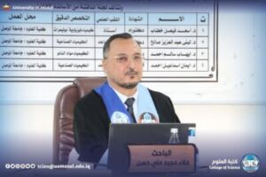 Today, Sunday, November 2, 2025, the master’s thesis submitted by student Alaa Majid Ali Hassan al-Khafaji was discussed in the Chemistry Department of the College of Sciences, tagged “studying the effect of the size of spent rubber crumbs and SBS On the specifications of asphalt axle”.