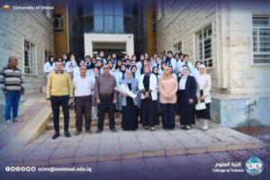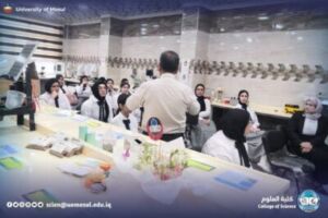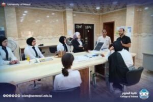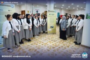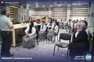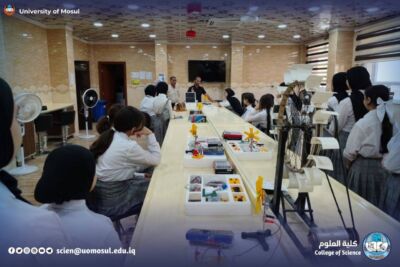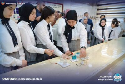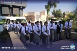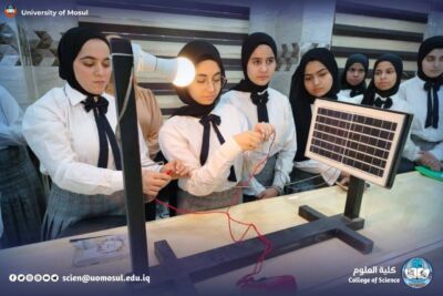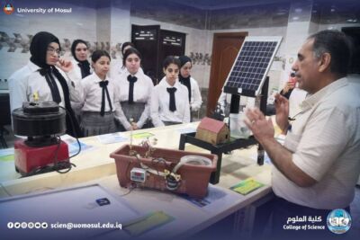 In order to embody the principle of continuous scientific cooperation between the University of Mosul and the Directorate of Nineveh education, and to strengthen international scientific partnerships within the (Solaware) project, and within the approach drawn by the University and based on the guidance of the president of the University of Mosul, prof. Dr. Wahid Mahmoud Brahimi, Under the guidance of the dean of the College of science, prof. Dr. Hiyam Adel Ibrahim, and the follow-up of the head of the Department of new and renewable energies, assistant prof. Dr. Ahmed Mounir Suhail, the Department of new and renewable energies received on Wednesday, October 29, 2025 a group of female students and staff of the Rafidain Land National Academy for girls In a scientific visit aimed at enhancing scientific and applied awareness in the field of renewable energies.