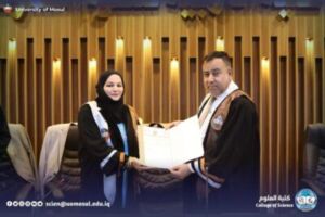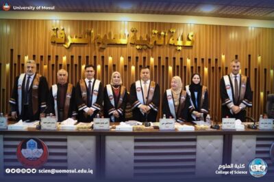 Within the framework of supporting scientific cooperation between the faculties of the University of Mosul, Prof. Dr. Jenan Abdul Khaliq Saeed, a member, and Prof. Dr. Amira Mahmoud Mohammed Al-Rawi, supervisor and member, from the Department of Biology sciences at the College of science, participated in the discussion of the tagged doctoral thesis:
