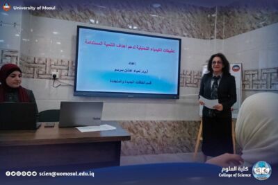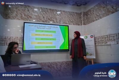 Under the patronage of the president of the University of Mosul, prof. Dr. Wahid Mahmoud Brahimi, and under the supervision of the dean of the College of science, prof. Dr. Hiyam Adel Ibrahim al – Taie, and in cooperation with the presidency of the University-Department of studies and Planning / Sustainable Development Unit, the Department of new and renewable energies organized a scientific workshop entitled: “Applications of Physical Chemistry and analytical chemistry to support the goals of sustainable development”, on Tuesday, November 25, 2025 in the Ibn Sina Hall of the Department, under the follow-up of the head of the Department, Assistant Professor Dr. Ahmed Munir Suhail.