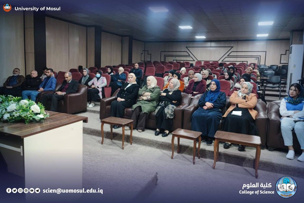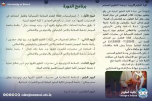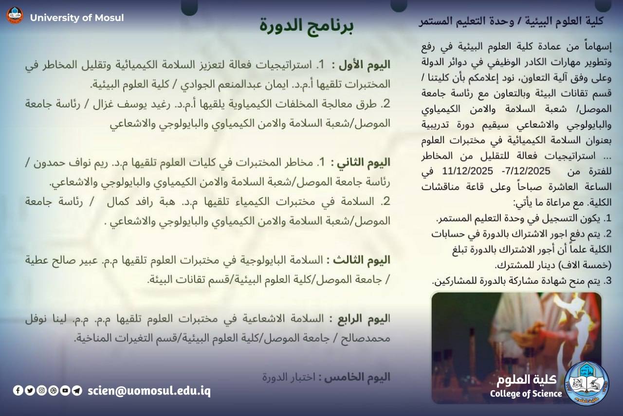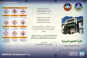 In accordance with the directives of the president of the University of Mosul, professor Dr. Wahid Mahmoud Ibrahim, and under the supervision and guidance of the dean of the College of science, professor Dr. Hiyam Adel Ibrahim, and the follow-up of the head of the Criminal Evidence Department, Assistant Professor Dr. Haitham Luqman Shahab, and within the continuing education programs, participated teaching in the Department of Forensic Evidence at our college, Dr. Reem Nawaf Hamdoun taught in the course (chemical safety in science laboratories … Effective strategies to reduce risks), held at the Faculty of Environmental Sciences – Department of environmental technologies and in cooperation with the presidency of Mosul University / division of chemical, biological and radiological safety and security, for the period 7-11 December 2025, it was held by a number of teachers of Mosul University, attended by a number of teachers and graduate students.