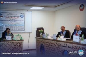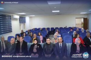 The master’s thesis submitted by the student (Nancy Naamat Boutros fattouhi) and tagged “preparation, diagnosis and study of molecular docking of some heterocyclic pentacyclic compounds derived from 5-bromoindole” was discussed in the chemistry department at the College of Sciences today, Monday, December 15, 2025, in the presence of the dean of the College, Professor Dr. Hiyam Adel Ibrahim, the administrative and Scientific Assistants of the dean, and the head of the Chemistry Department, Assistant Professor Dr. The Honorable Firas Ahmed dhanoon and a number of the best teachers of the college.