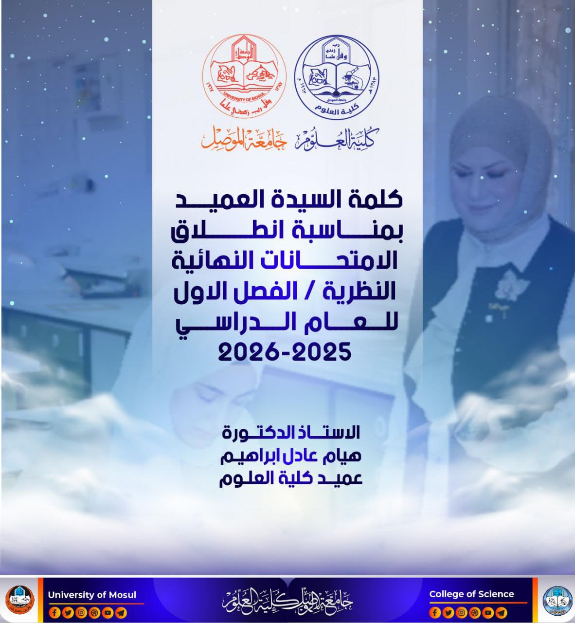 With the start of the theoretical final exams for the first semester of the academic year 2025-2026, we wish you — our dear students in the Departments of our college — the most sincere wishes of good luck, success and continuous excellence. Today you are standing on the threshold of an important stage in your scientific career, a stage that requires more diligence, perseverance and determination, and we are confident in your ability to overcome it with honorable giving that opens up prospects for a promising future for you.