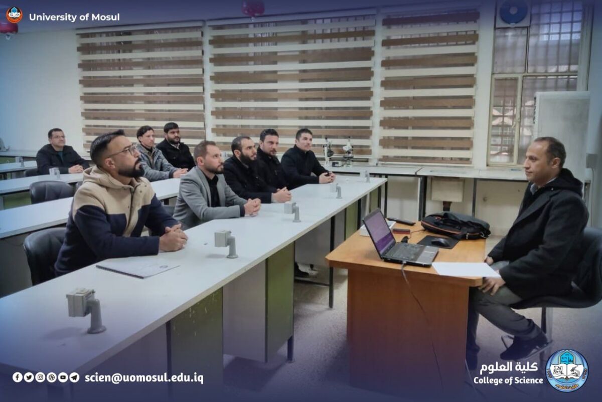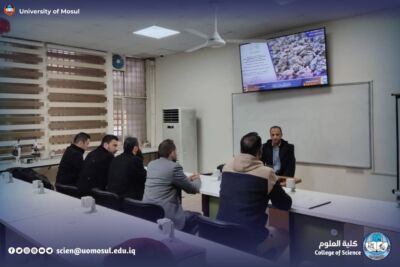 Under the patronage of the president of the University of Mosul, professor Dr. Wahid Mahmoud Brahimi, and under the supervision and follow-up of the dean of the College of science, professor Dr. Hiyam Adel Ibrahim al-Taie, and within the continuing education courses at our college, the Department of Geology and petroleum Sciences held a training workshop entitled (metamorphic processes and their impact on the porosity of rocks ) in cooperation with the College of petroleum engineering and mining on December 29, 2025, attended by a number of professors of the department and graduate students, the workshop included three lectures :