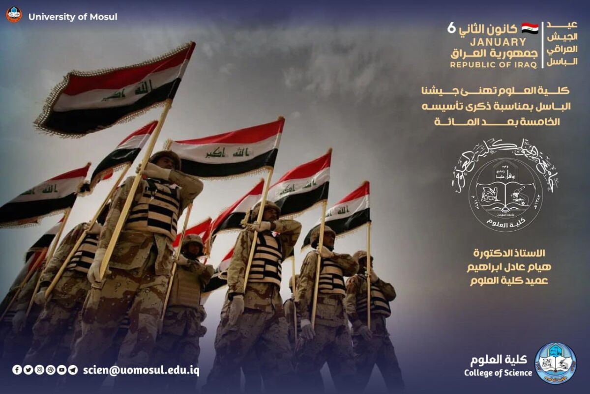 The College of Science, with all its cadres, represented by the dean of the college, professor Dr. Hiyam Adel Ibrahim al-Taie, and its students and pioneers, extends its highest congratulations to the heroes of our great Iraqi army, all kinds of officers, ranks and soldiers, on the fifth centenary of the founding of our valiant army.