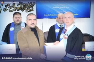 At the end of the discussion, the head of the physics department, assistant professor Dr. Samir Mahmoud Ahmed, presented a letter of thanks and appreciation to assistant professor Dr. Ahmed Walid Kassem from the northern Technical University/Engineering Technical College, in appreciation of his participation in the discussion Committee.