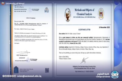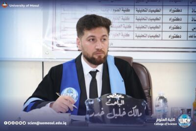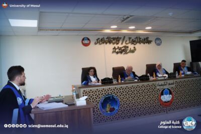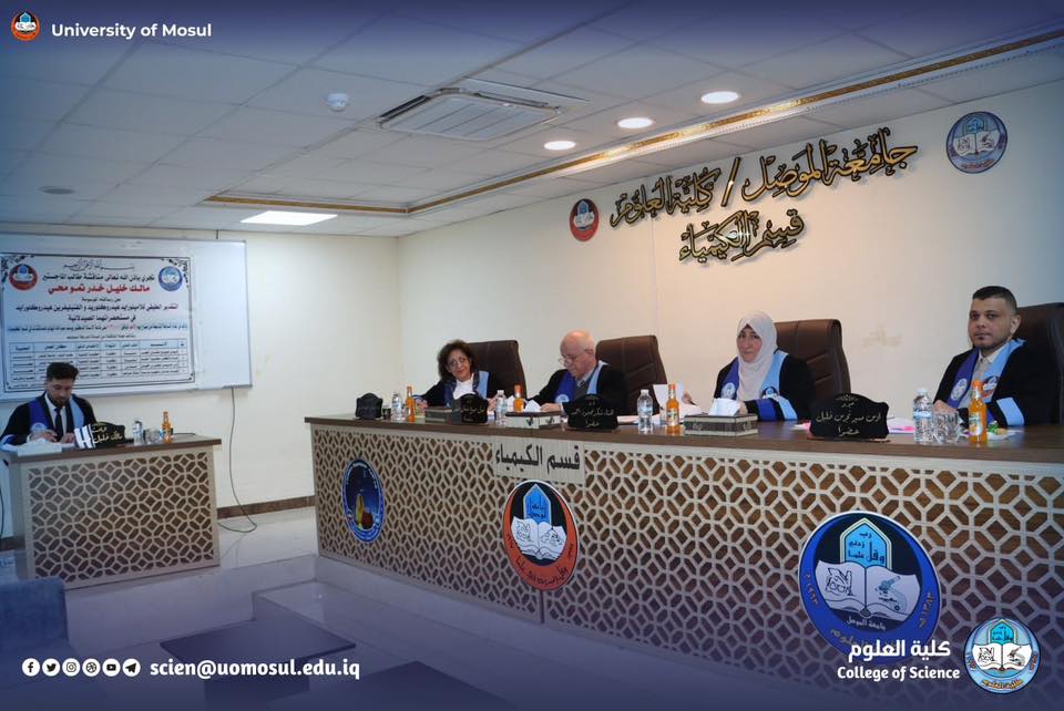 The Department of Chemistry at the College of Science / University of Mosul discussed on Sunday, January 11, 2026 the master’s thesis submitted by student Malik Khalil Khader Tamou Mohi from the analytical chemistry branch, tagged ” spectral estimation of amiloride hydrochloride and Phenylephrine Hydrochloride in their pharmaceutical preparations ” .
