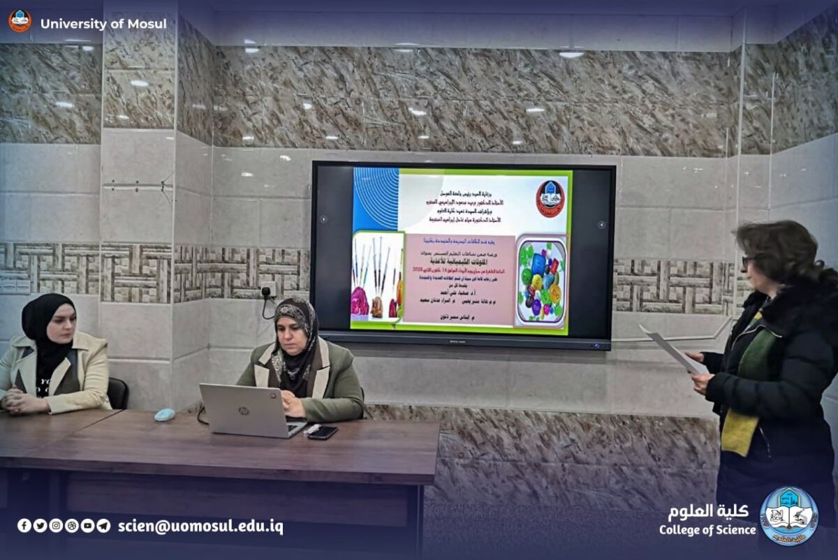 The workshop dealt with the introduction of chemical contamination of food, which occurs when a dangerous or toxic food substance reaches the food, which starts from being a raw material until it reaches the consumer as a final product, which makes it harmful and unfit for human consumption. the workshop dealt with the sources of chemical pollutants of food and the problems and types of chemical pollutants, including food additives, industrial colorants, heavy metals, medical drugs, chemical pesticides and the need to add them in small quantities and remain among the components of food when ingested. the objectives of food additives, which are added intentionally or for foods to save from Pollution and biogeochemical factors of spoilage, enhance its nutritional value, to give the right texture to the product and improve it in terms of shape, color and taste.