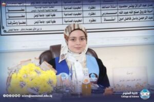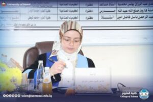On behalf of the Dean of the College of Science, Professor Dr. Hiyam Adel Ibrahim, the Head of the Chemistry Department, Professor Dr. Firas Ahmed Dhunoun, presented a letter of thanks and appreciation to Assistant Professor Dr. Huda Abdul-Razzaq Younis Mahmoud in recognition of her participation and scientific contributions, which enriched the discussion and contributed to the development of the thesis.