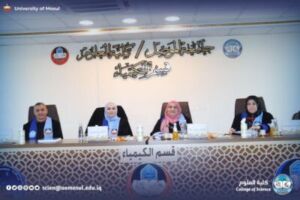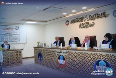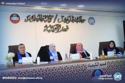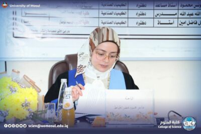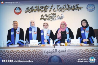 The Chemistry Department at the College of Science, University of Mosul, discussed a master’s thesis entitled “Preparation of Heterogeneous Solid Catalysts from Broad Bean Shells for Biodiesel Production from Non-Edible Oils” on Sunday, January 18, 2026, in the presence of several professors, researchers, and graduate students.