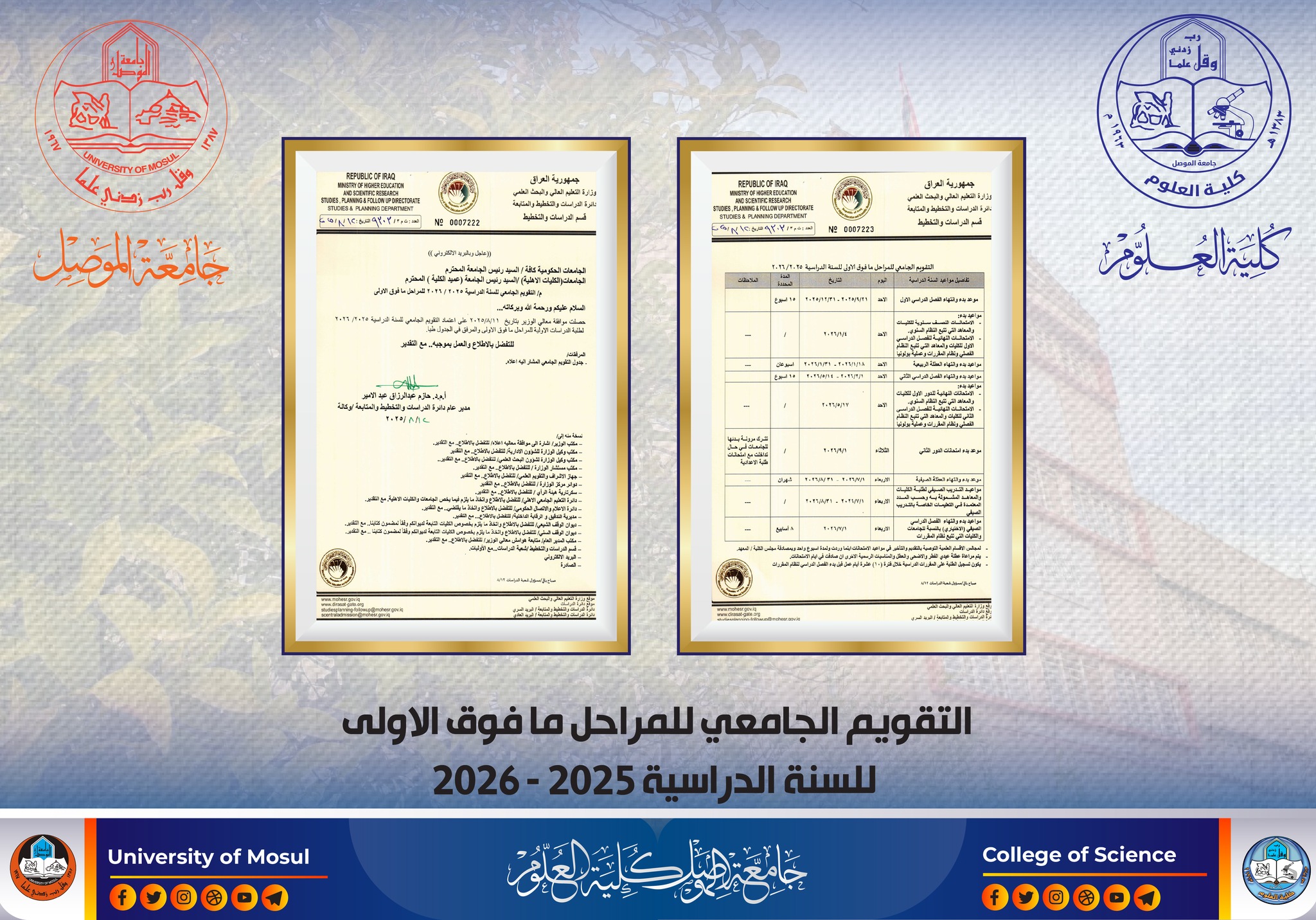 The Ministry of Higher Education and Scientific Research / Directorate of Studies, Planning, and Follow-Up has announced the adoption of the academic calendar for the 2025–2026 academic year for undergraduate students (above the first stage), [Read More]