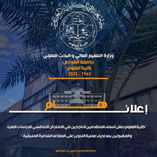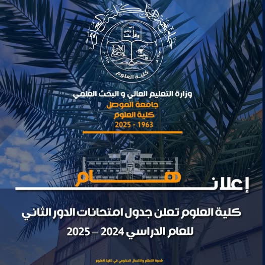 The College of Science at the University of Mosul has announced the schedule for the second-round examinations for all scientific departments for the academic year 2024–2025. The exams will commence on Monday, September 1, 2025. [Read More]
