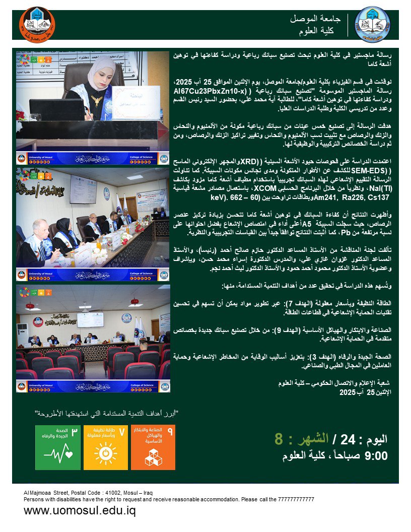 The Department of Physics at the College of Science, University of Mosul, discussed on Monday, August 25, 2025, the master’s thesis titled:“Fabrication of Quaternary Alloys (Al67Cu23PbxZn10-x) and Evaluation of Their Efficiency in Gamma-Ray Attenuation”,presented by [Read More]